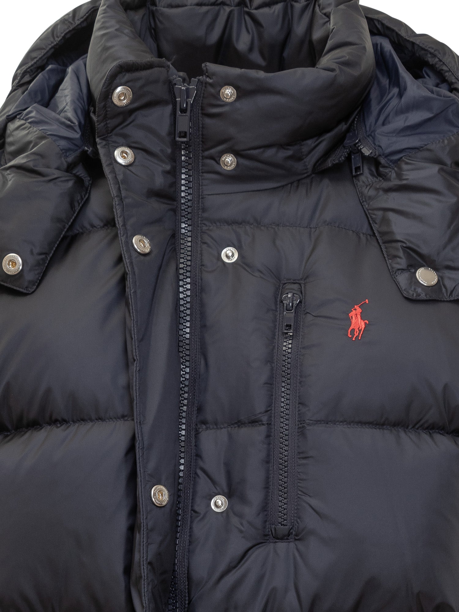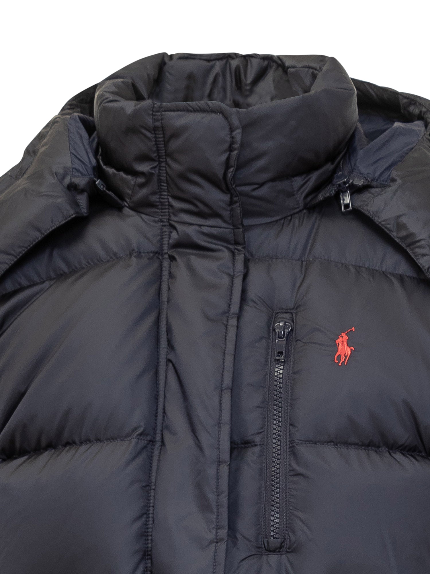 Ralph Lauren padded jacket in glossy black nylon with warm filling, adjustable hood and contrasting embroidered logo.