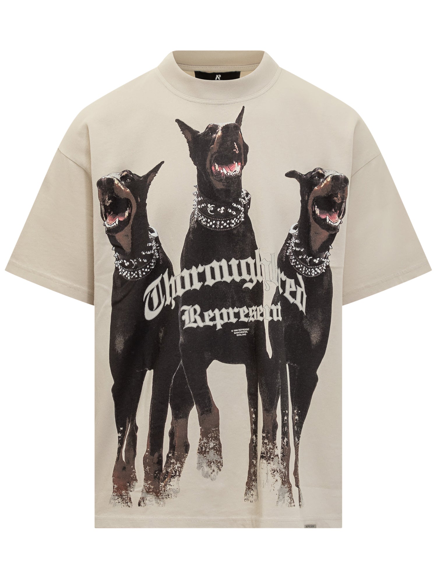 Represent beige cotton T-shirt featuring a bold front graphic of three Dobermanns with gothic lettering.