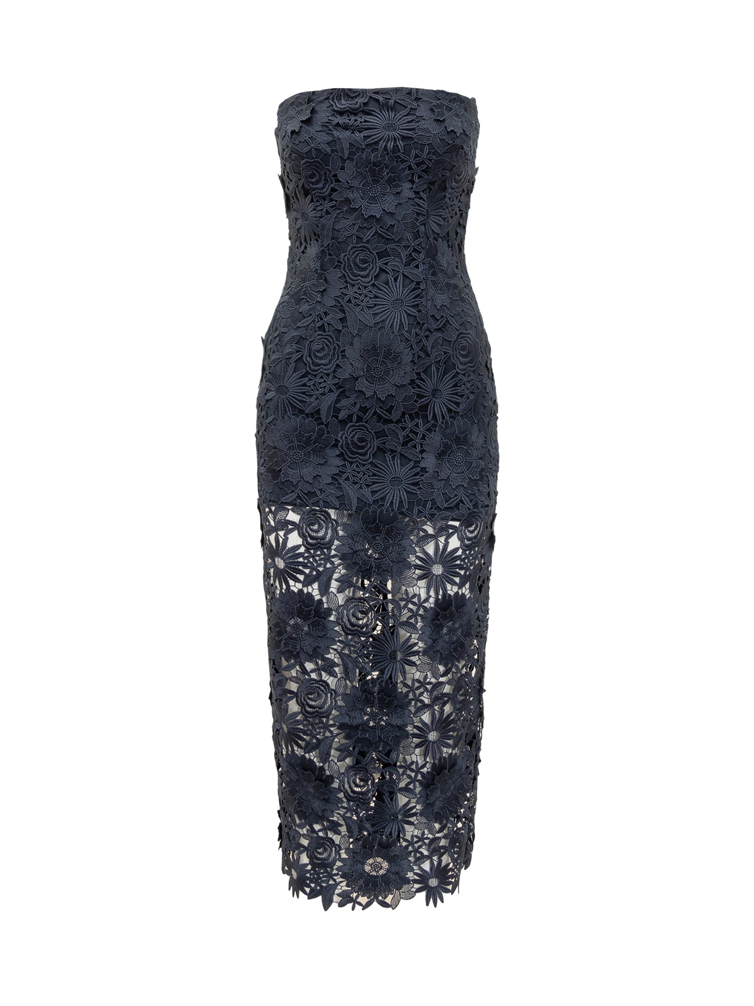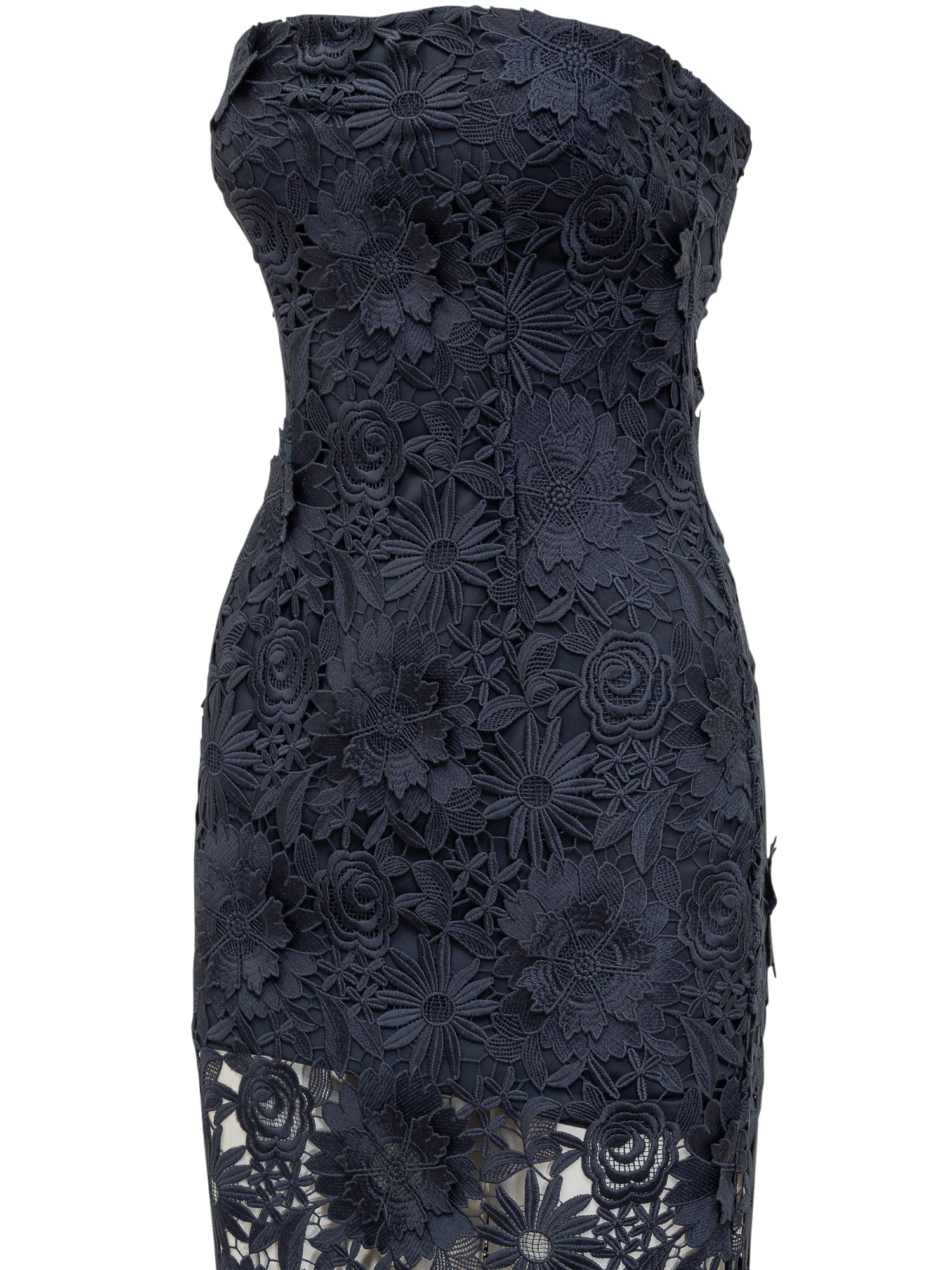 ROTATE black floral lace midi dress, strapless with a fitted silhouette and sheer detailing at the hem.