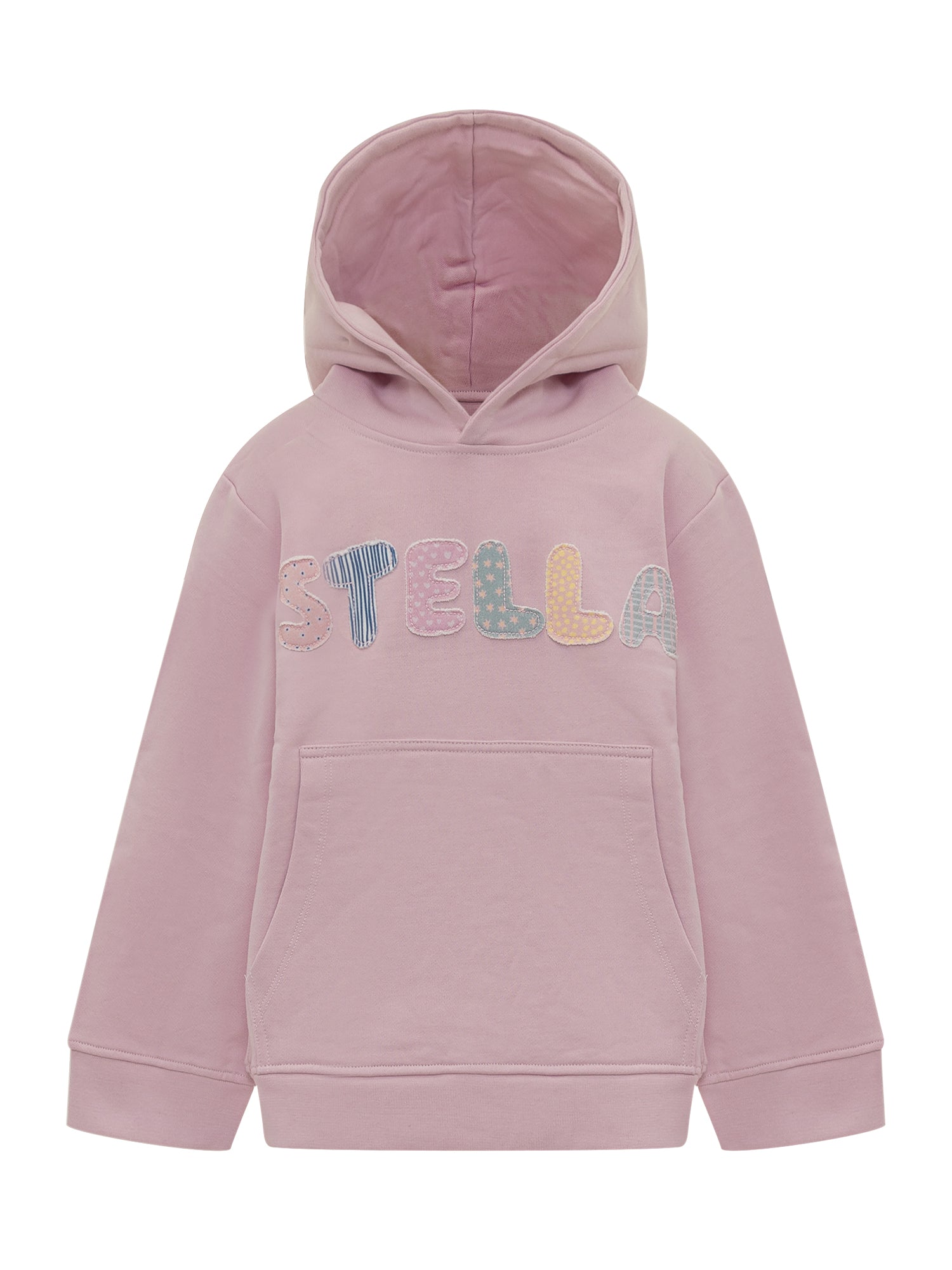 Stella McCartney pink cotton hoodie featuring a multicolor patchwork logo on the front. Soft and sustainable,.
