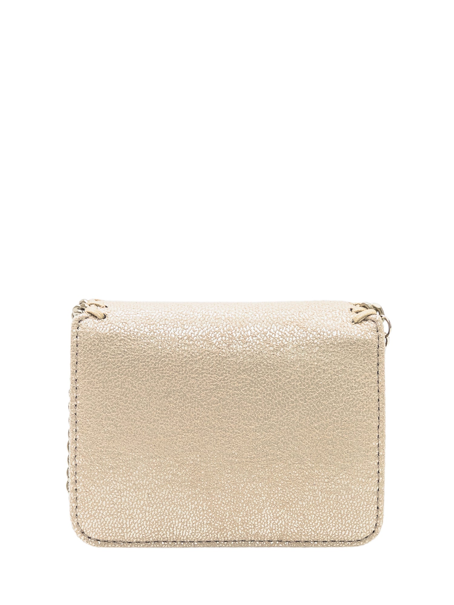 Compact laminated wallet with a shimmering finish and metal chain detailing along the edges.