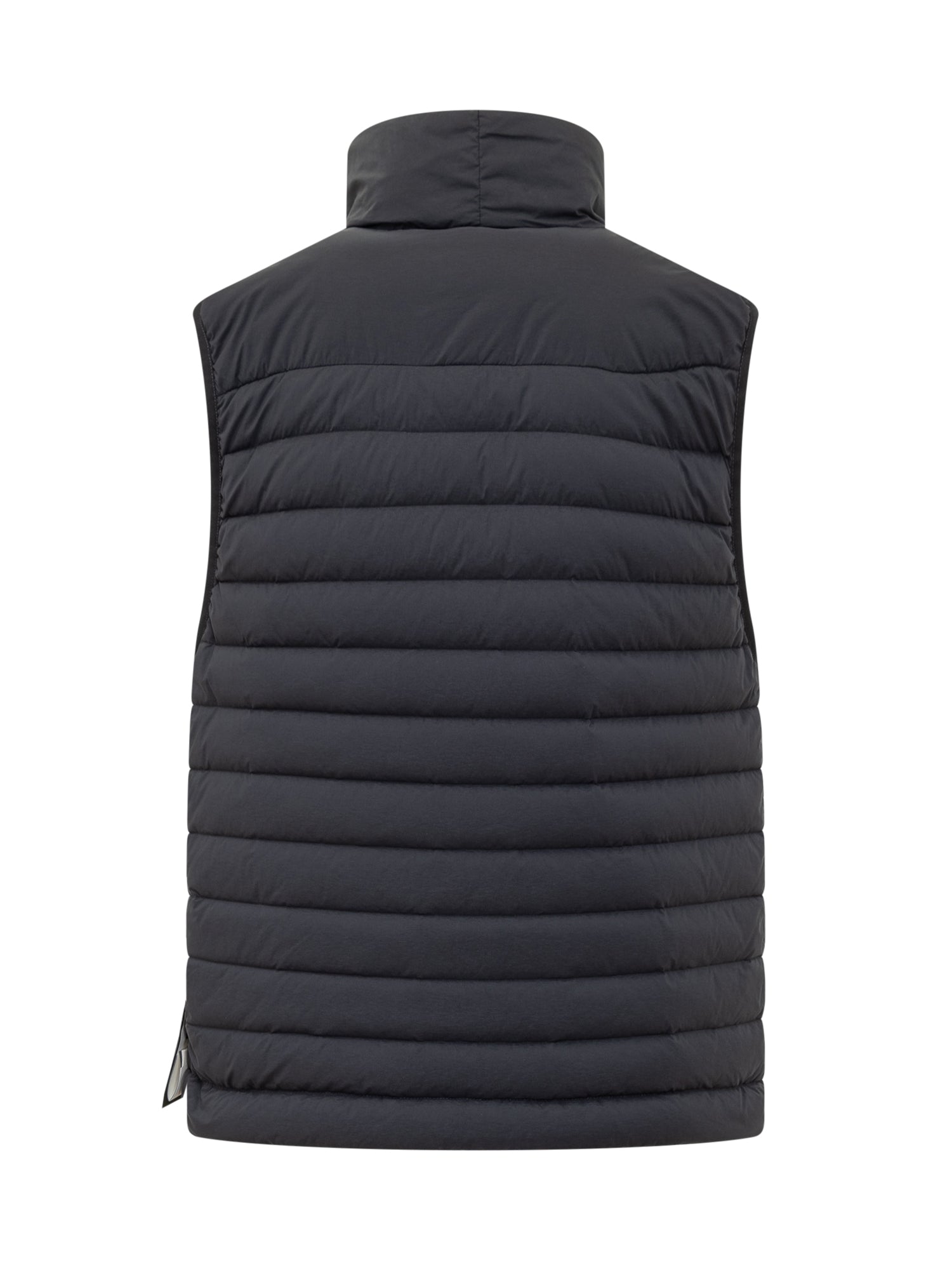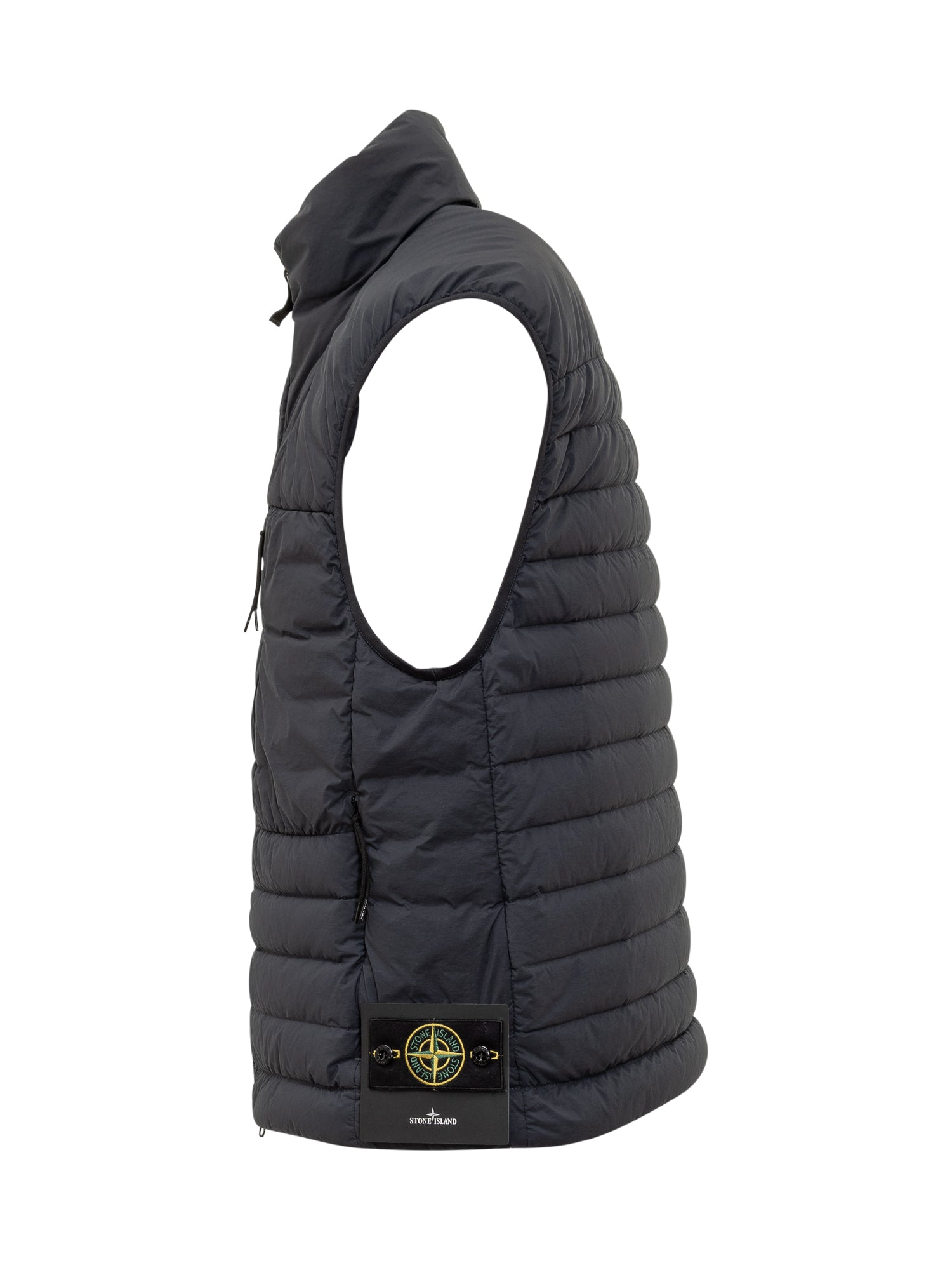 Stone Island black nylon vest with light padding, two-way zip closure and front zip pockets. Logo patch on the side and technical design.