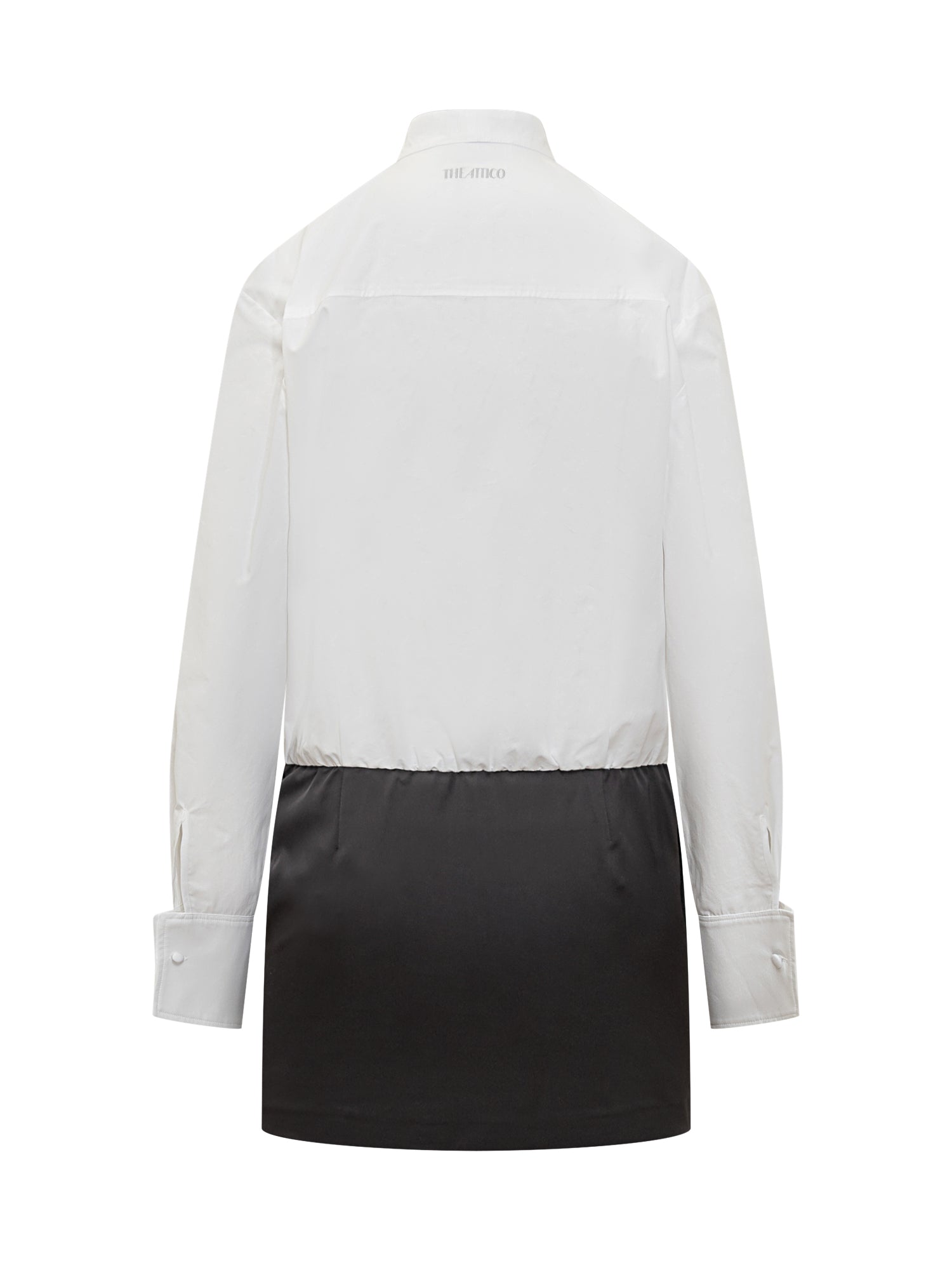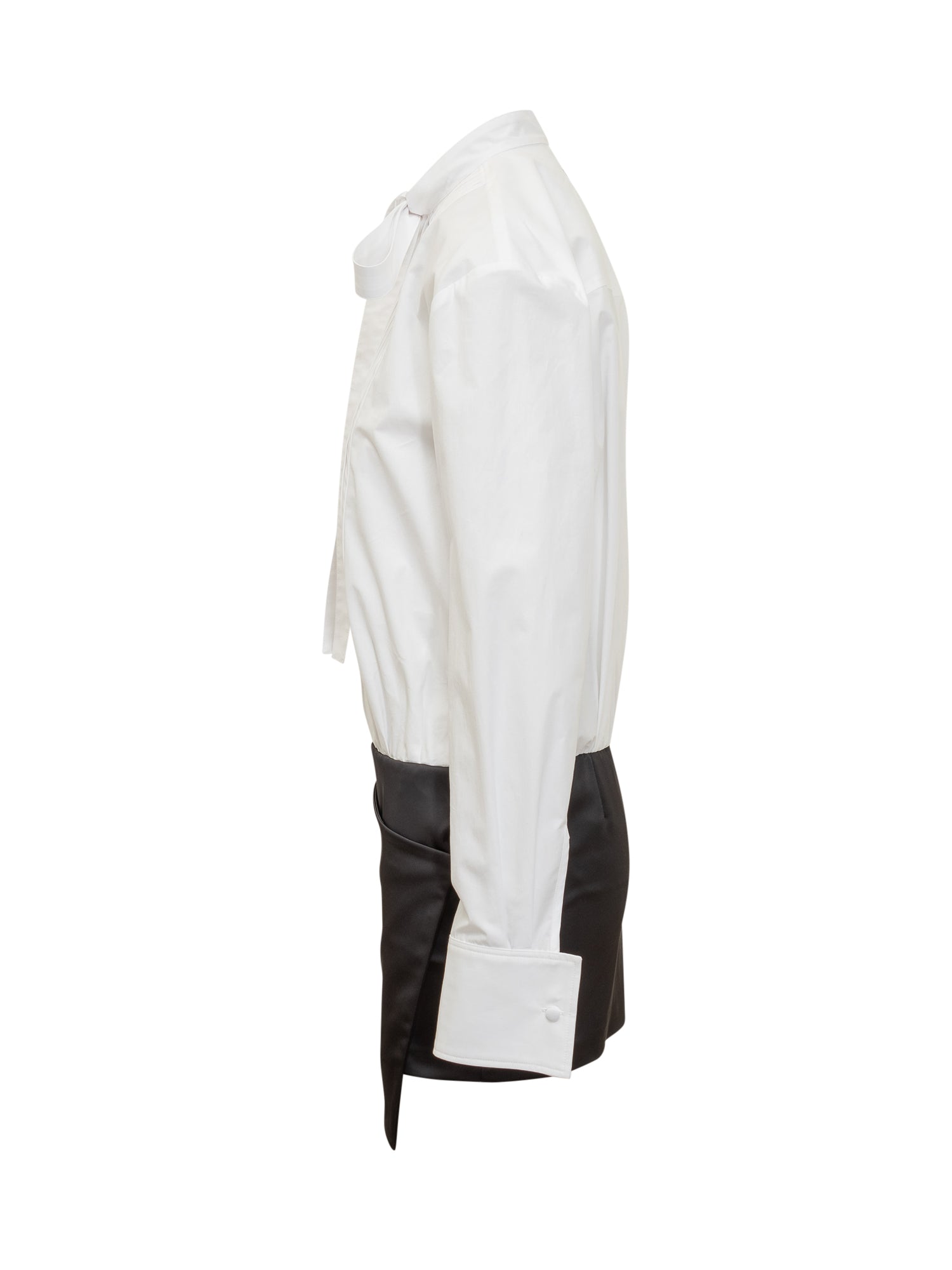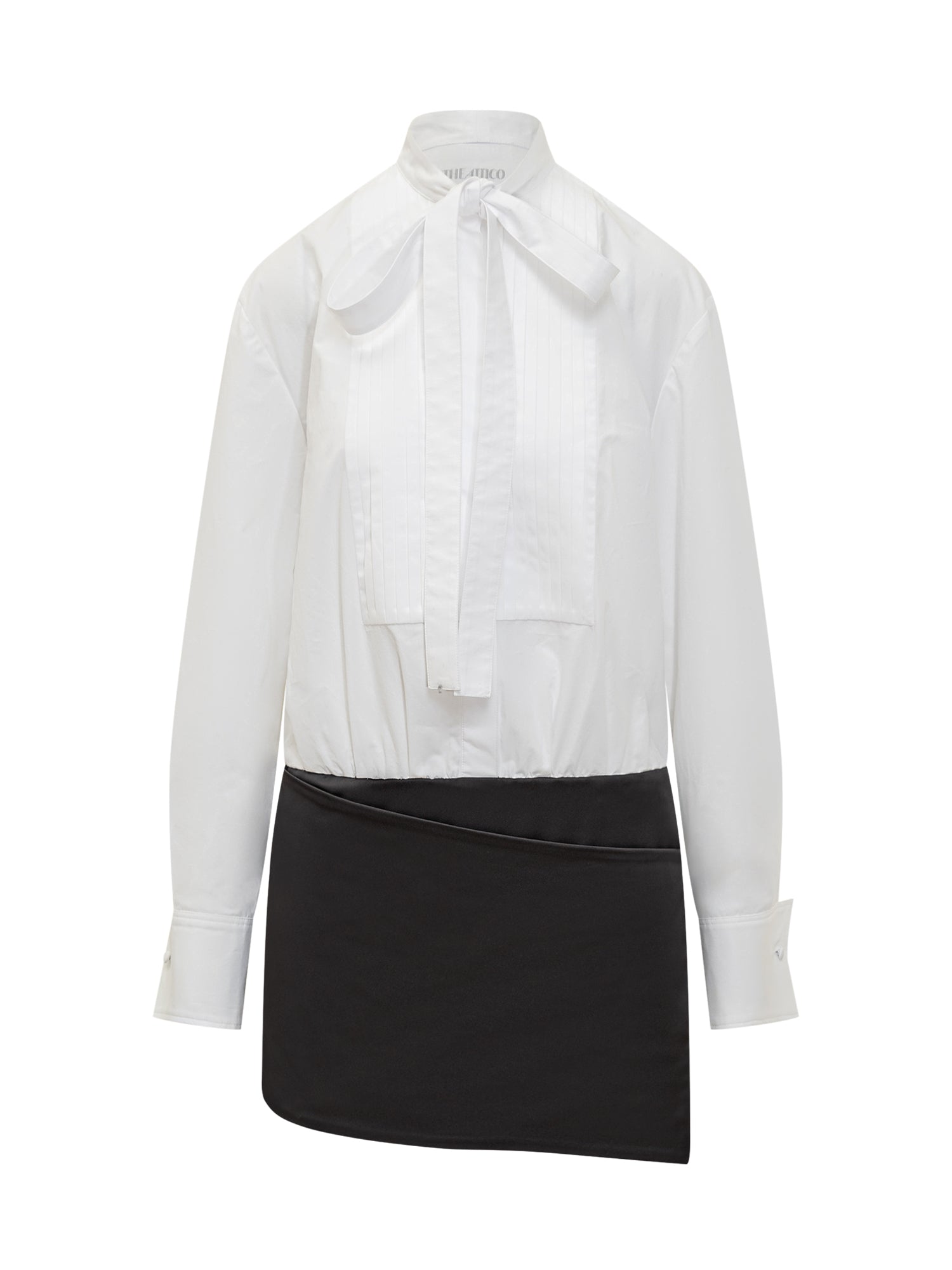 Elegant blouse with neck bow and pleated front panel. The contrasting lower layer adds a refined, modern touch.