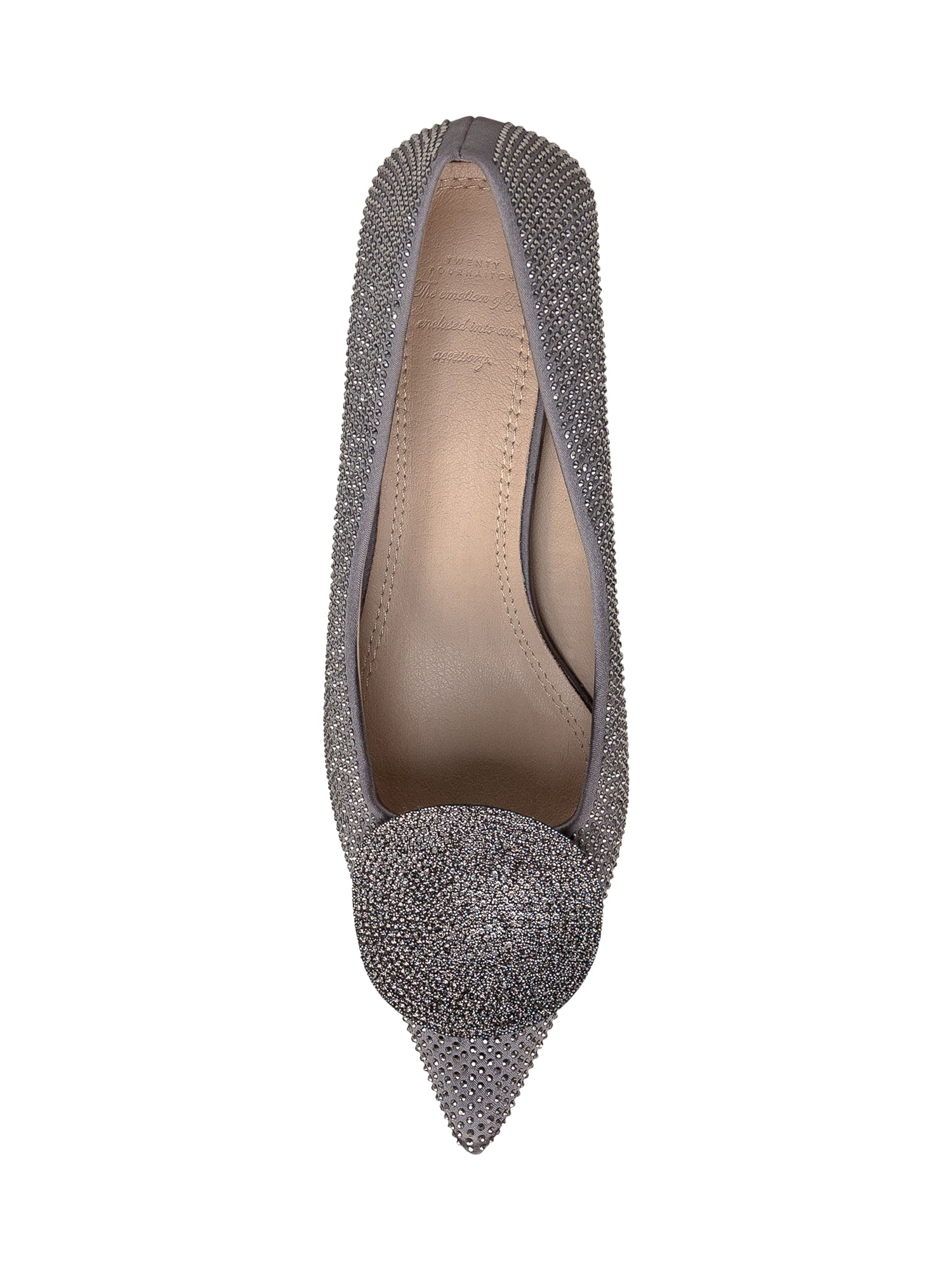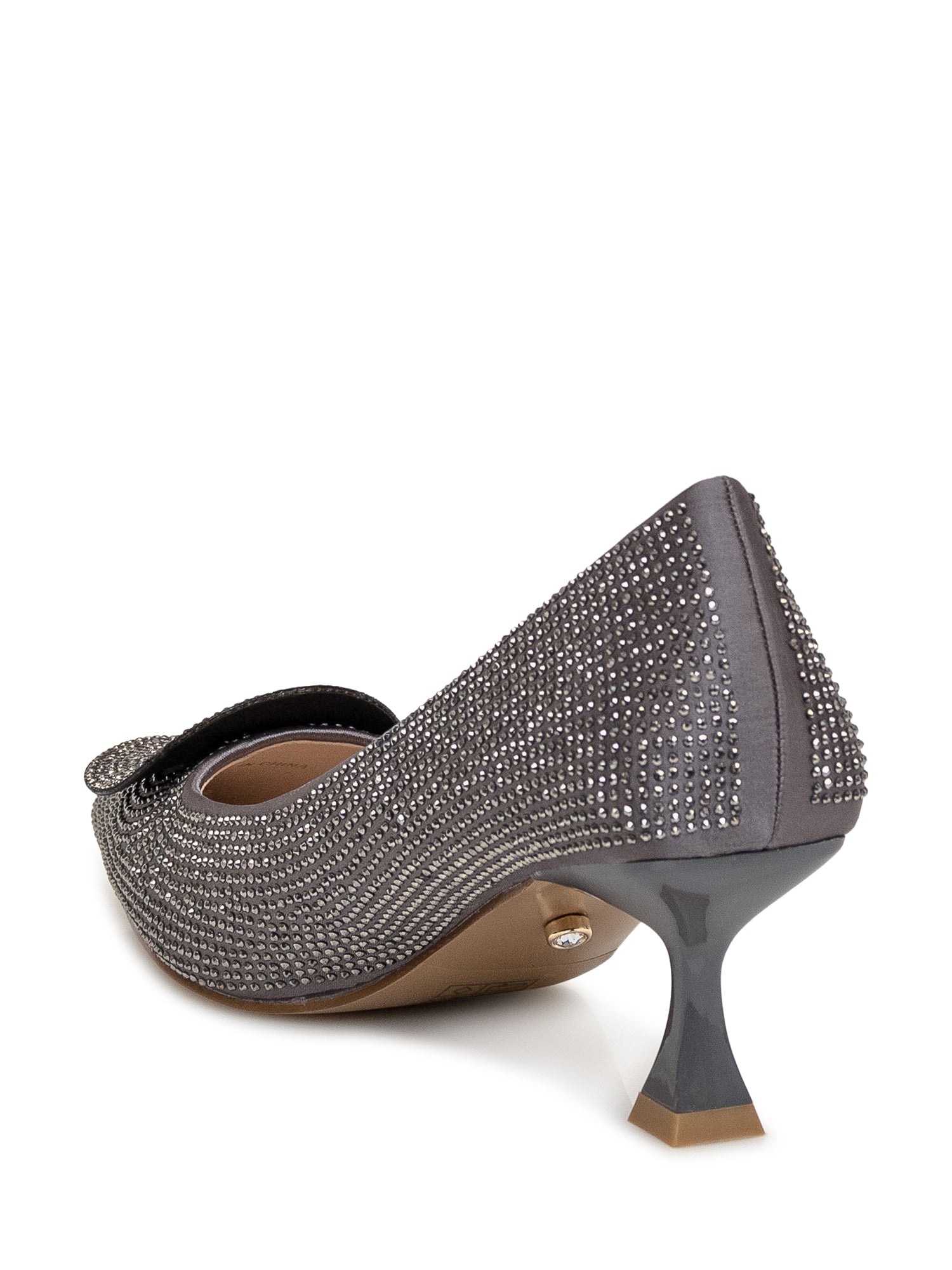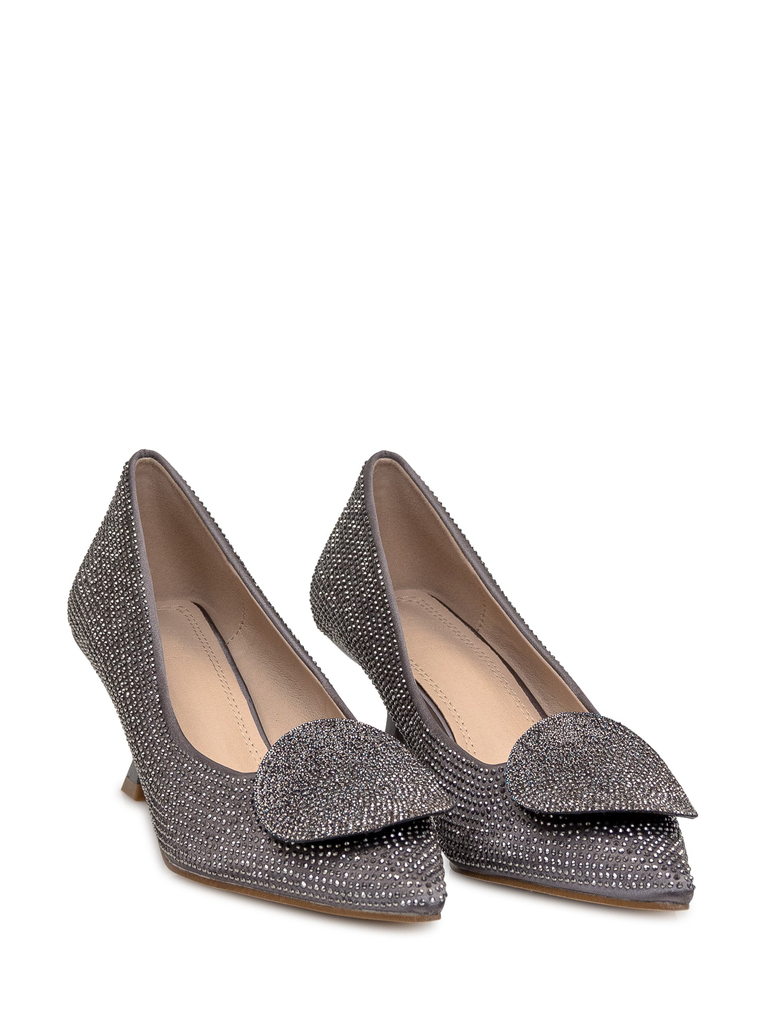 Fabric pumps with all-over applied rhinestones. Square heel. Rhinestone appliqué on front.