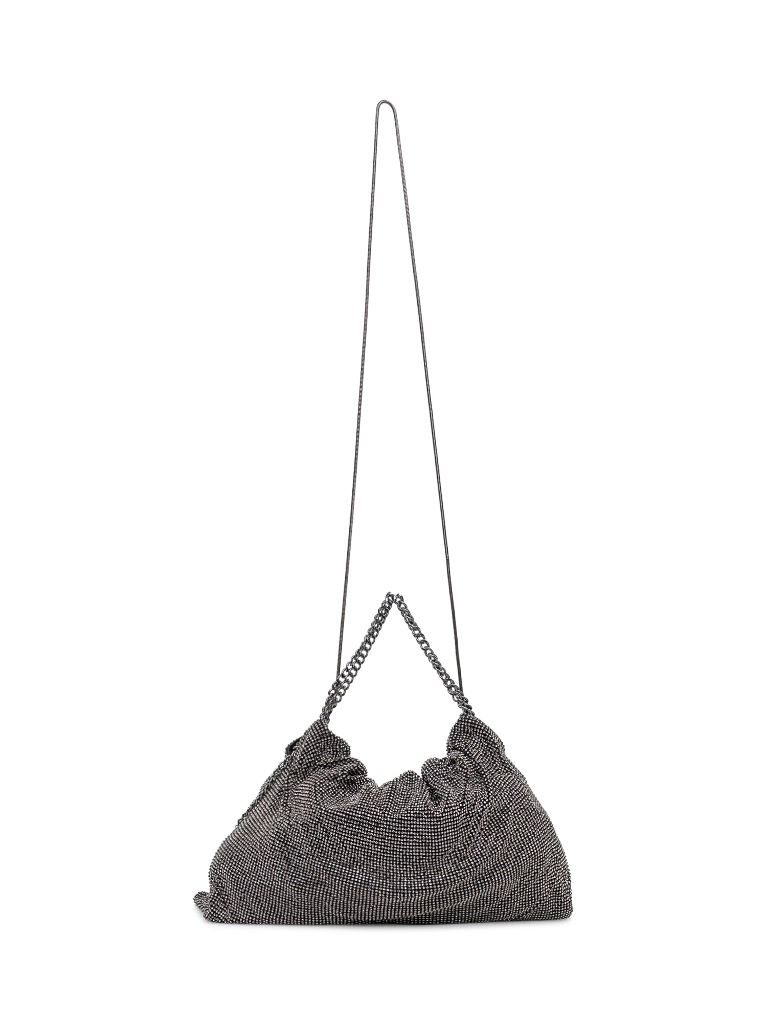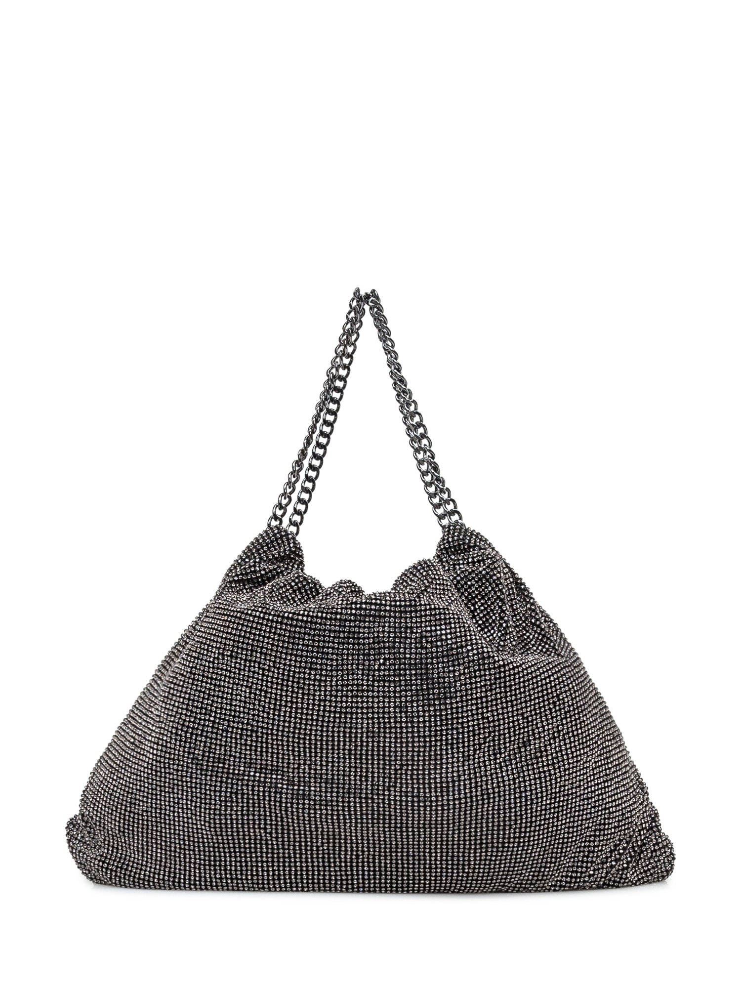 Black shopper bag embellished with sparkling crystals and double chain handles.