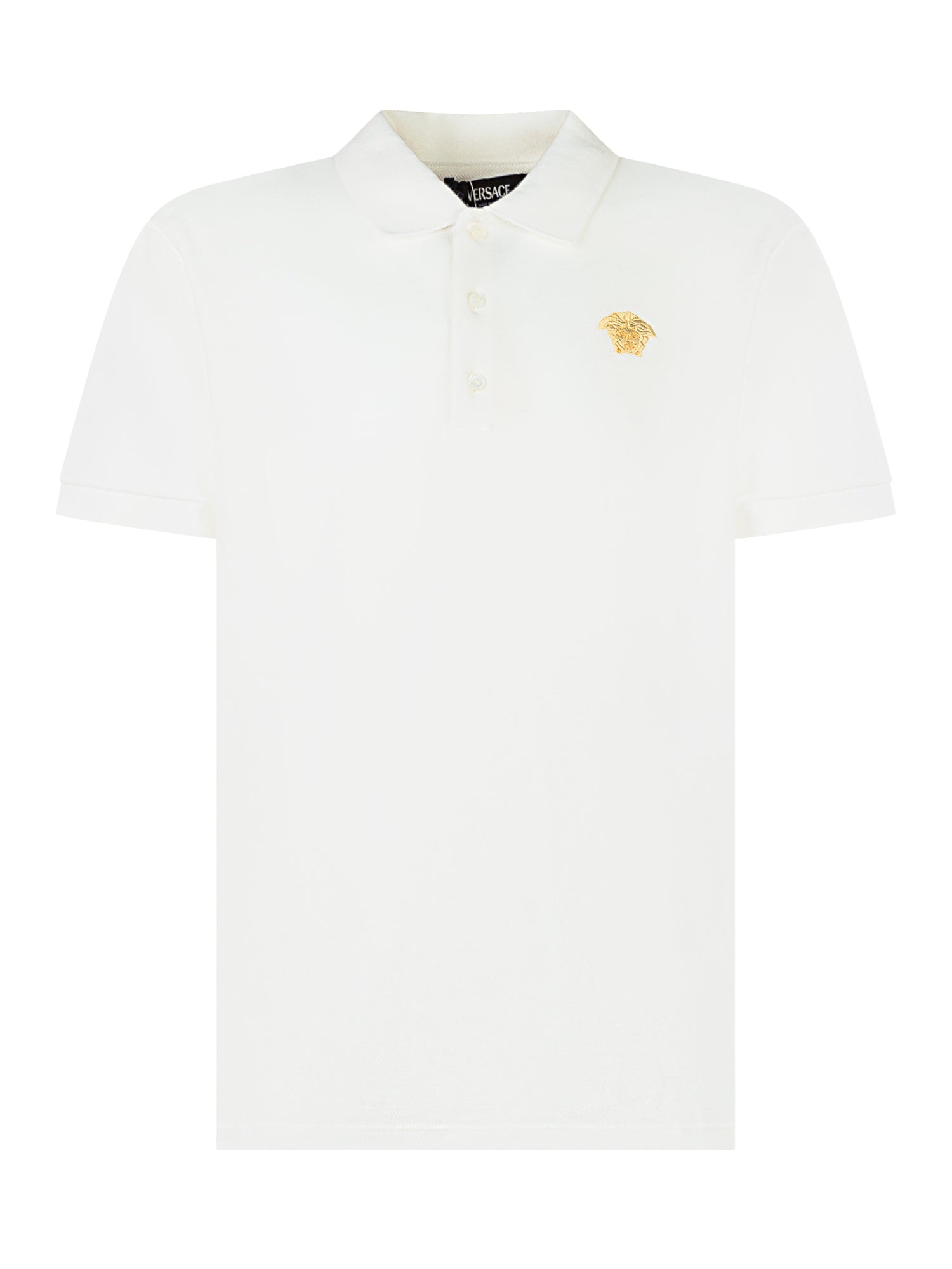 Versace Kids white cotton polo shirt featuring the iconic Medusa logo embroidered in gold on the chest.