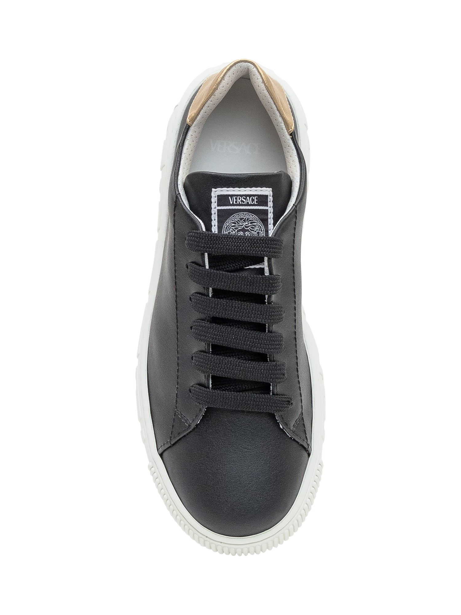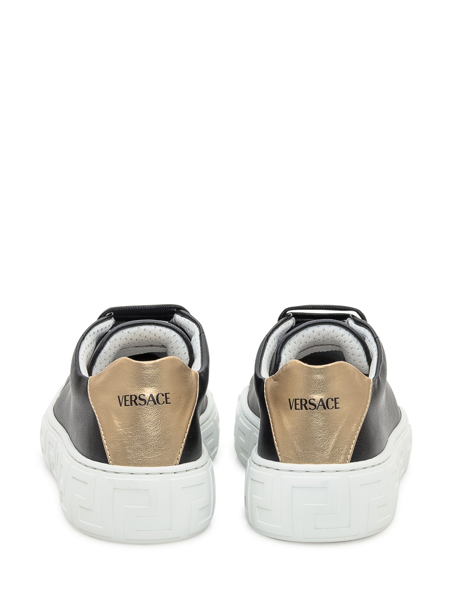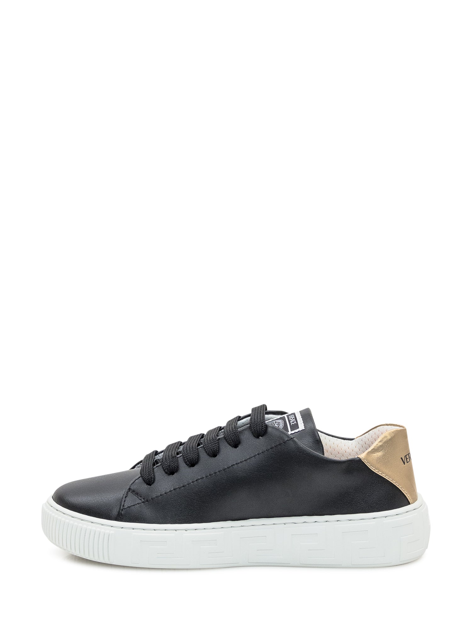Versace Kids leather sneakers in black with metallic gold heel and white sole featuring Greca motif.