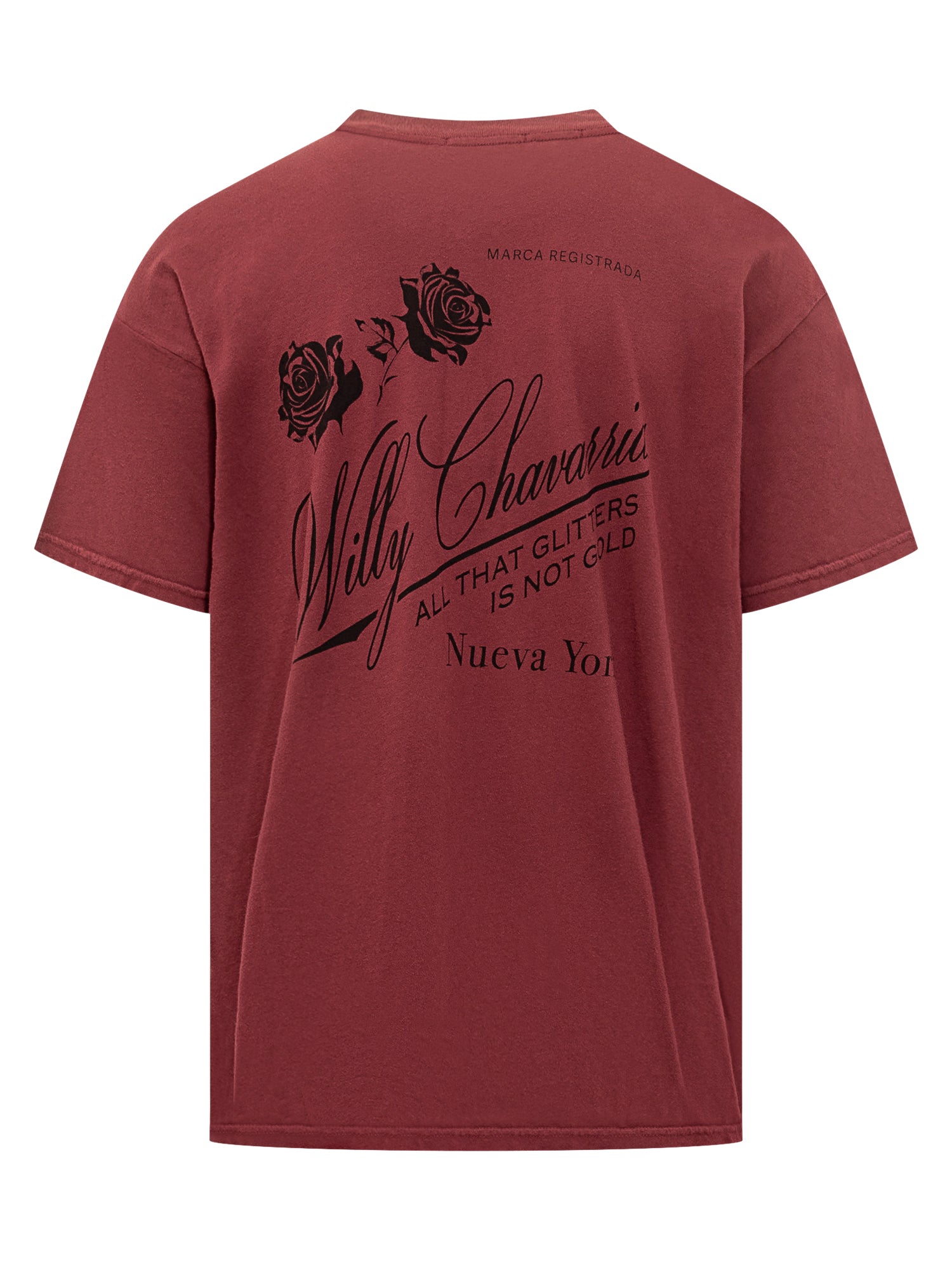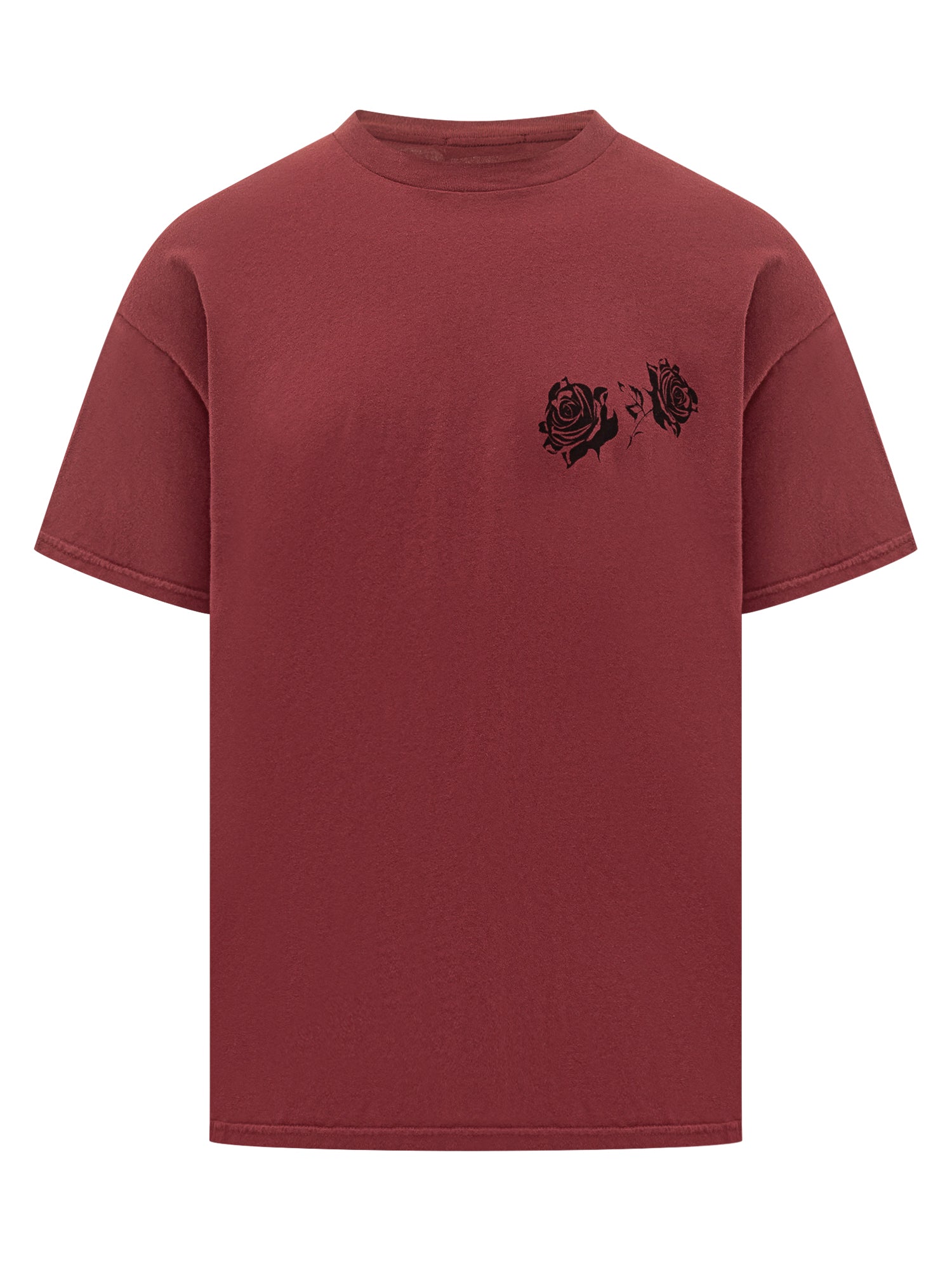 Willy Chavarria burgundy cotton T-shirt with black rose print on the chest. Oversized fit and minimalist design with iconic details.