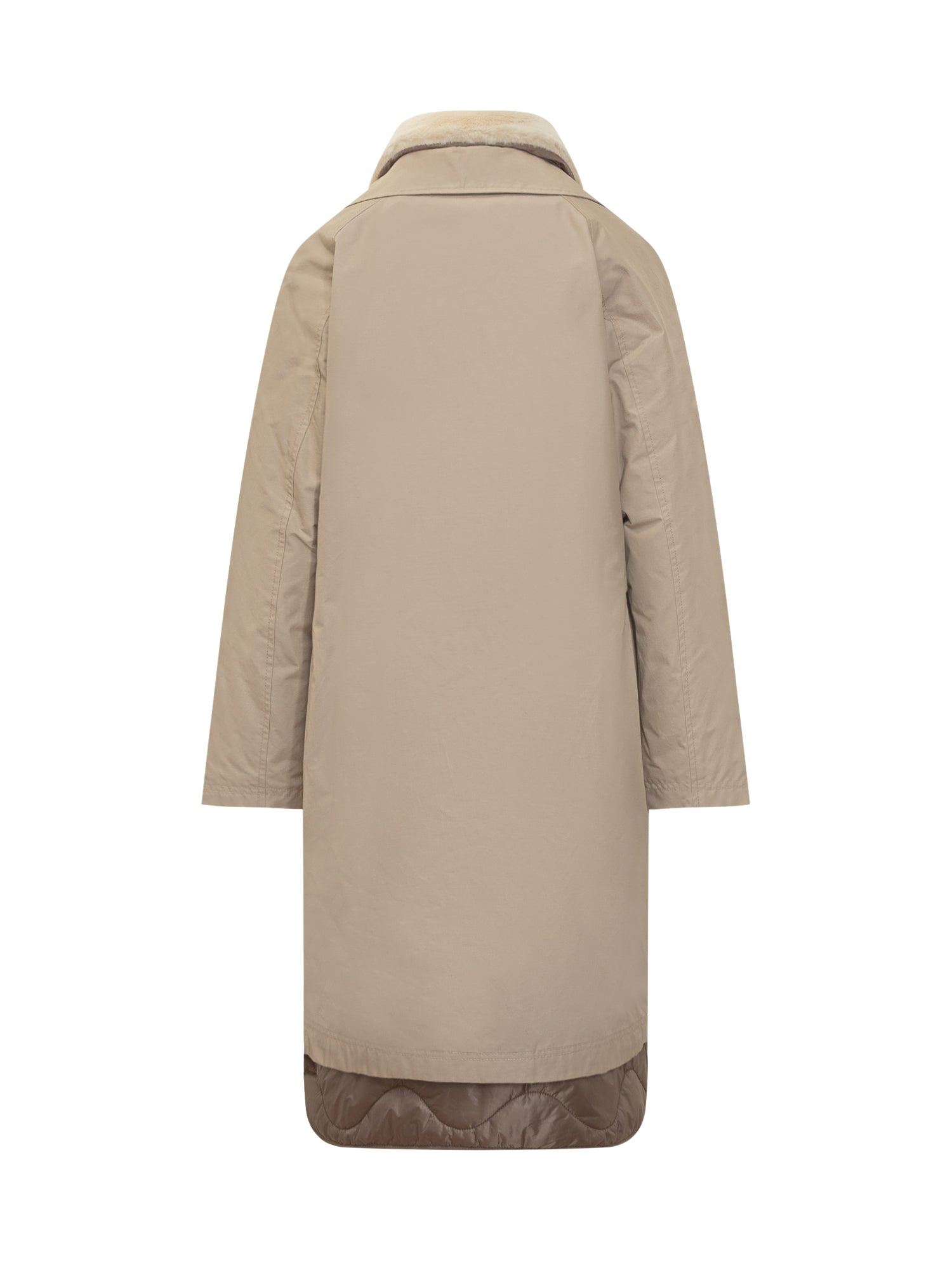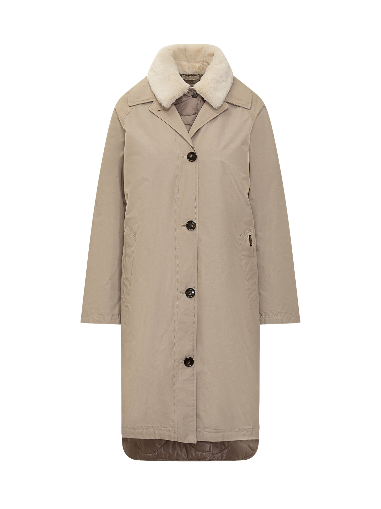 Woolrich All Weather beige coat with shearling collar and button closure.