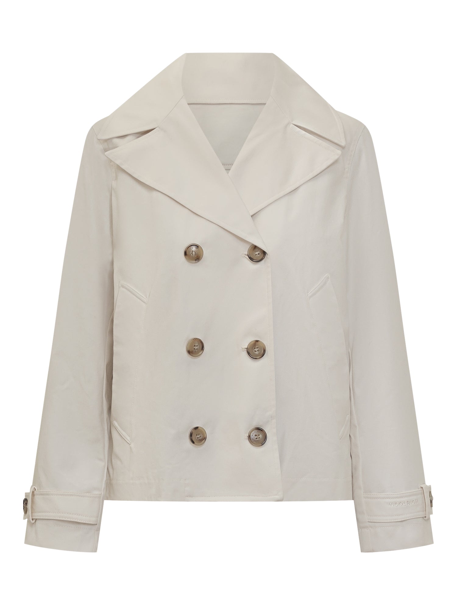 Made of pure cotton. Water-repellent fabric. Cotton blend lining for the body and nylon for the sleeves. Collar with lapels. Double-breasted button fastening. Side welt pockets. Adjustable cuffs with tab and buttons. Back pleat. Tongue with embroidered logo.