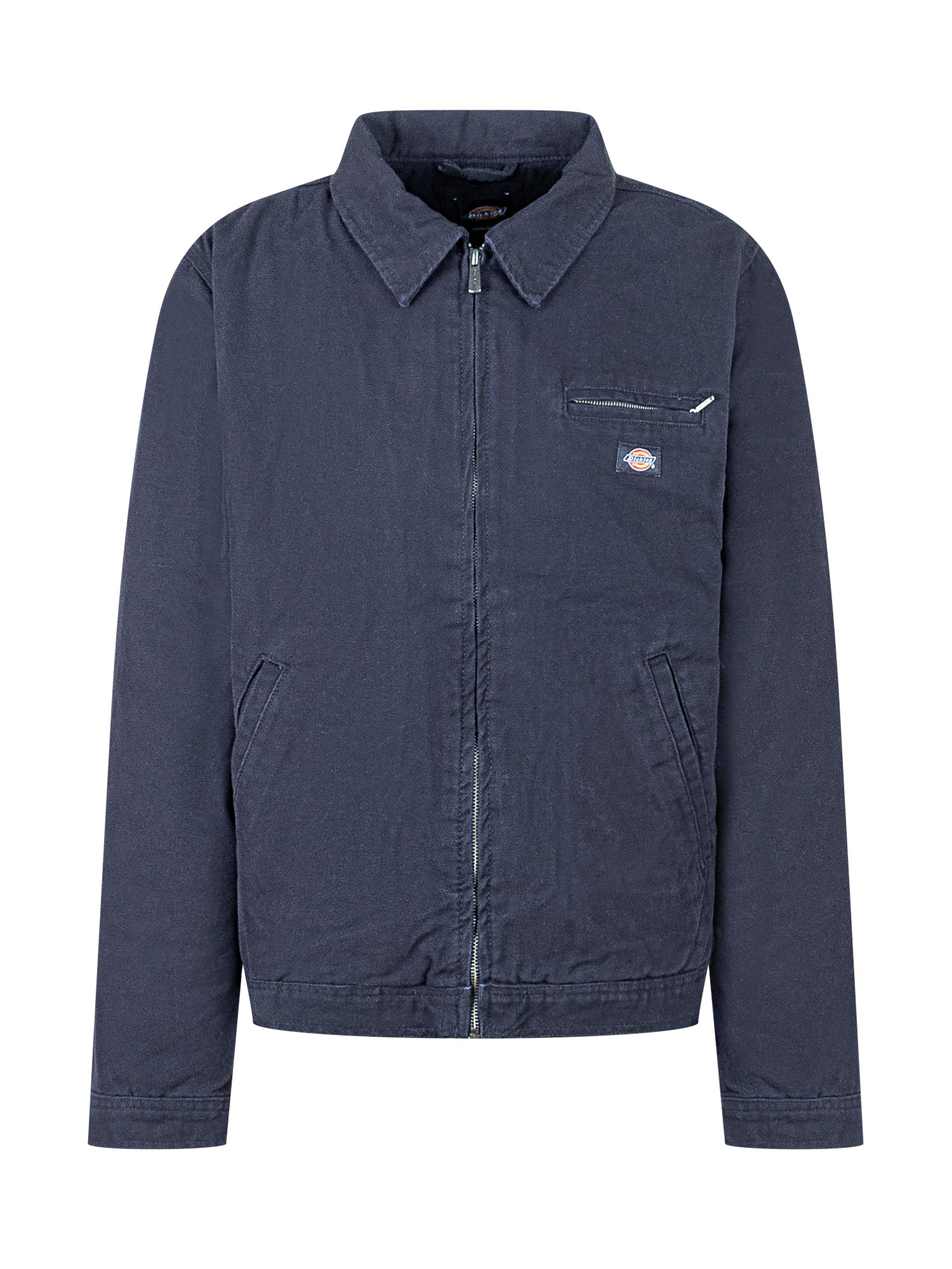 Dickies navy blue jacket featuring front zip closure and side pockets. Designed with a chest zip pocket and logo patch.