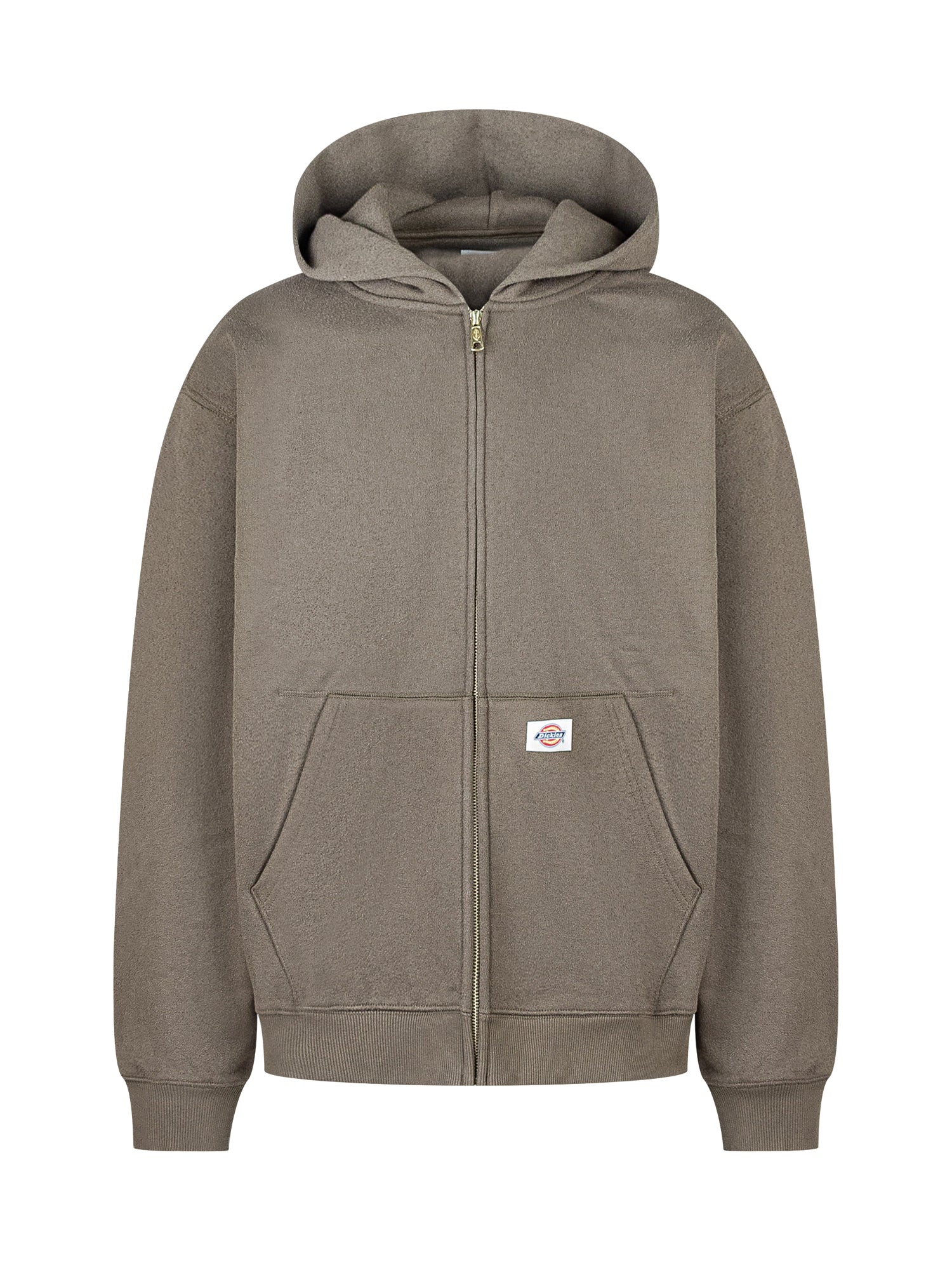 Dickies khaki hoodie with adjustable hood and front zip closure. Features kangaroo pockets and logo patch.