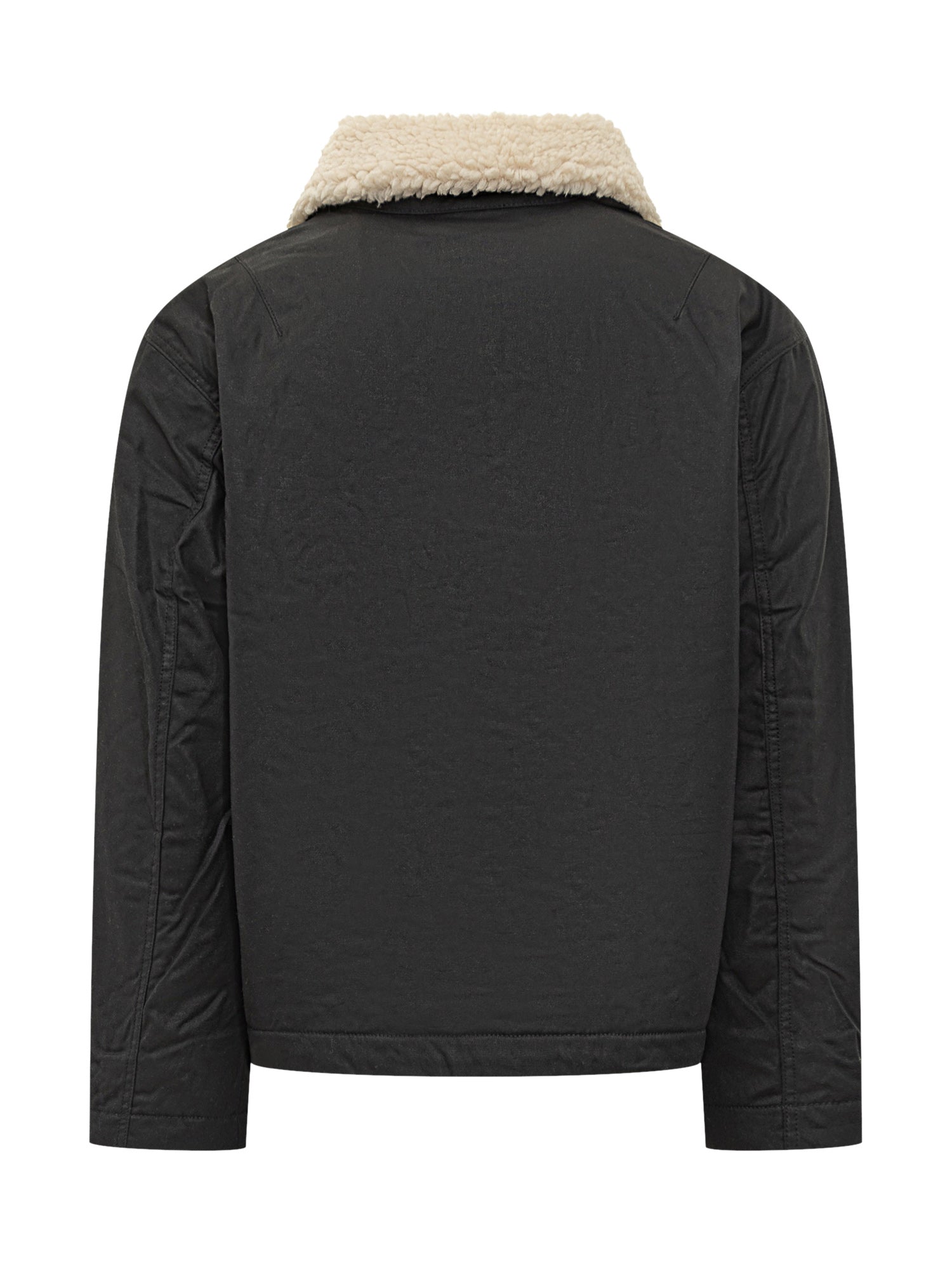 Dickies Threads Sangrey black waxed jacket with shearling collar and button closure.