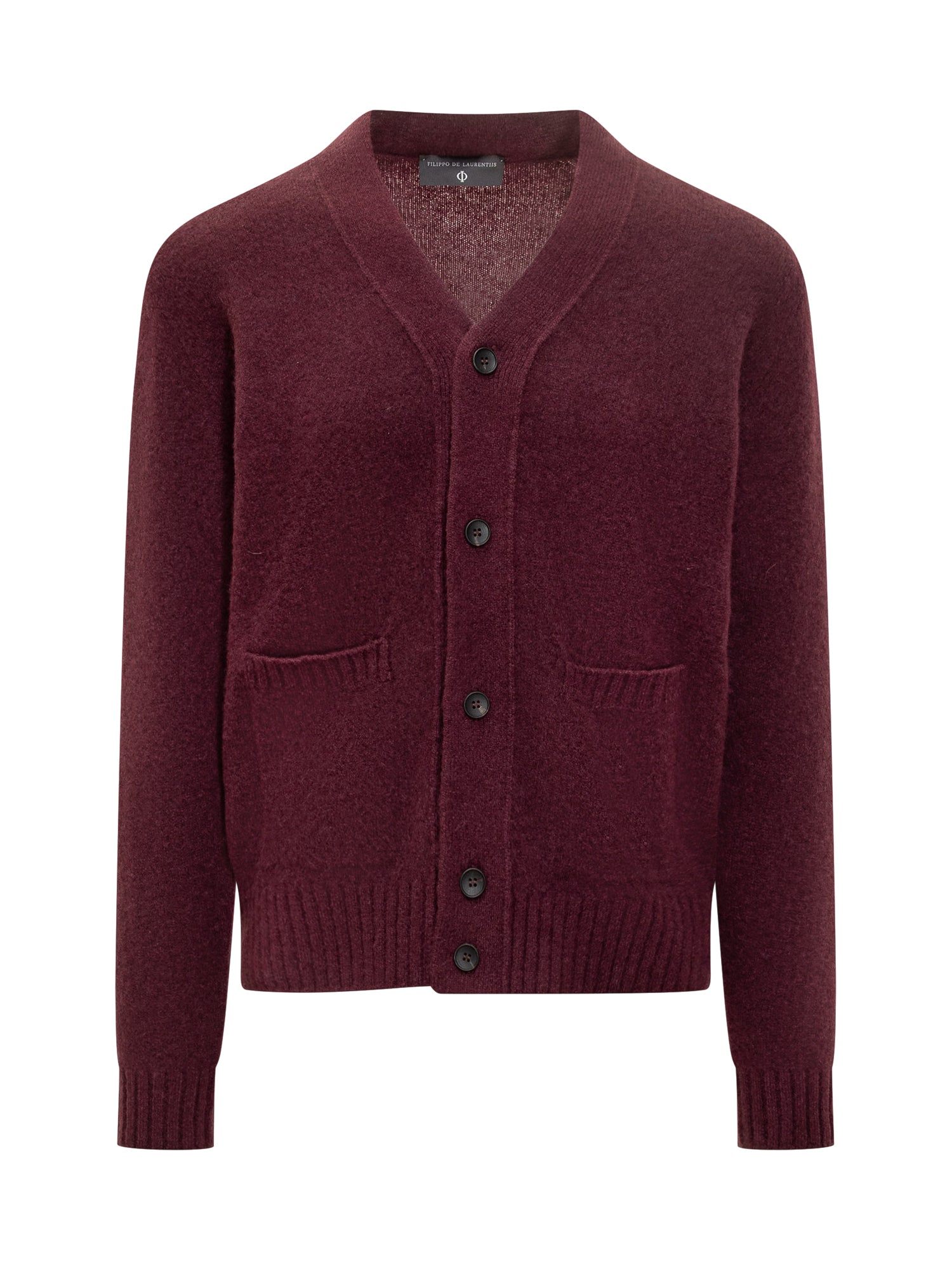 Filippo De Laurentiis cardigan in soft bordeaux wool with V-neck, buttons and front pockets.