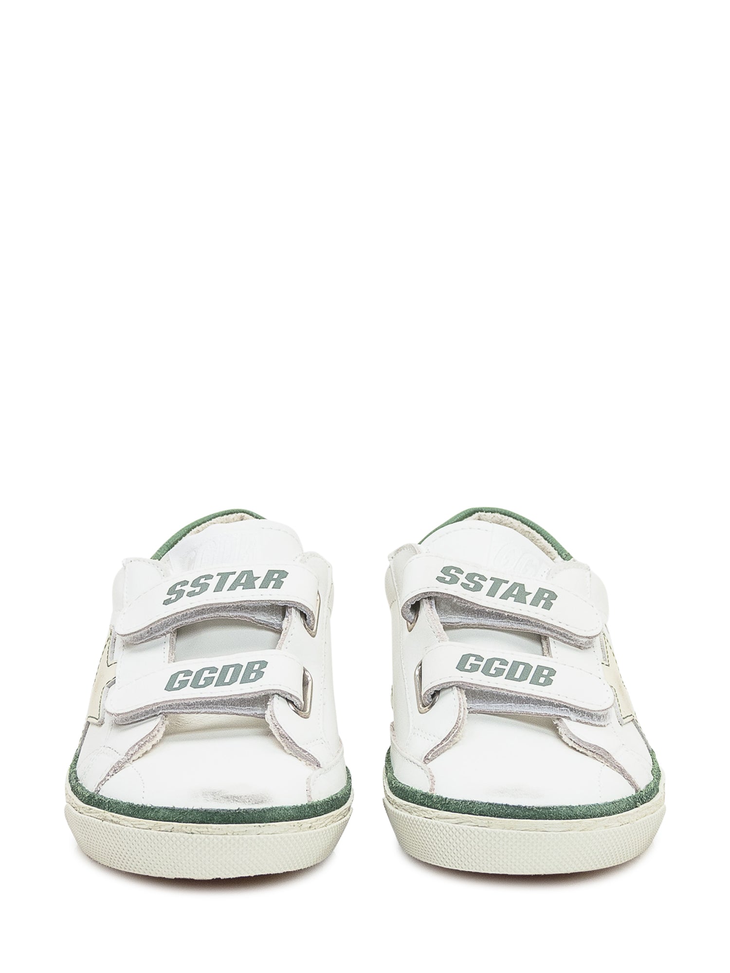 Golden Goose Kids Old School sneaker in white leather with beige star, green details and double velcro straps.