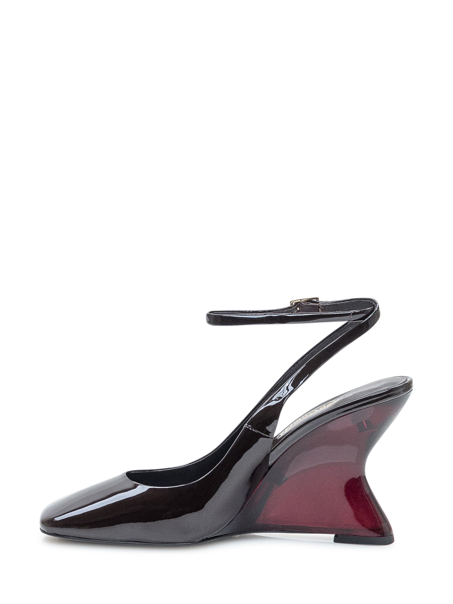 Jeffrey Campbell black patent pumps with ankle strap and two-tone red and black sculptural wedge.