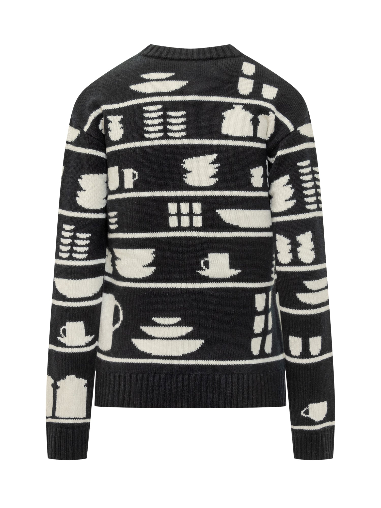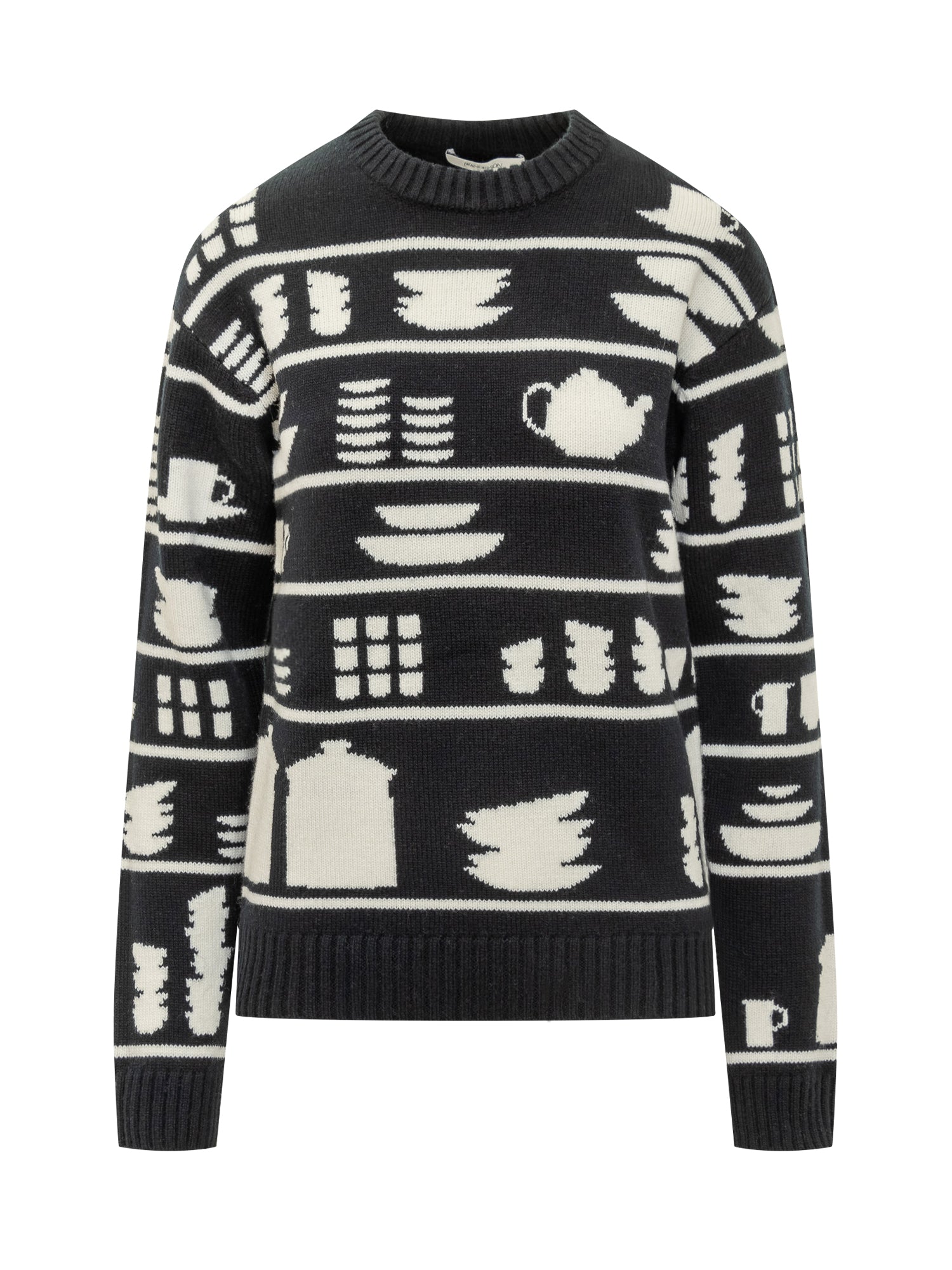 Wool crewneck sweater with bold white graphics inspired by tea sets.