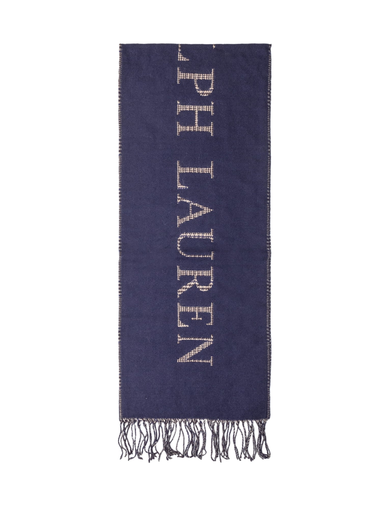 Soft scarf featuring a contrasting woven logo and fringed edges.