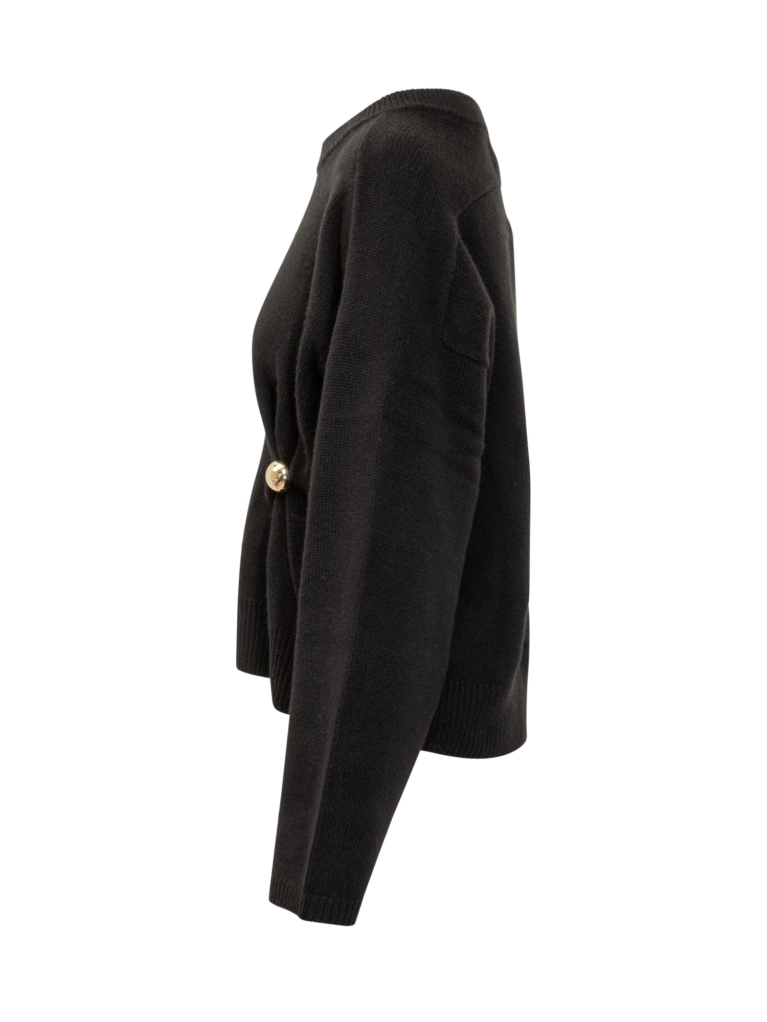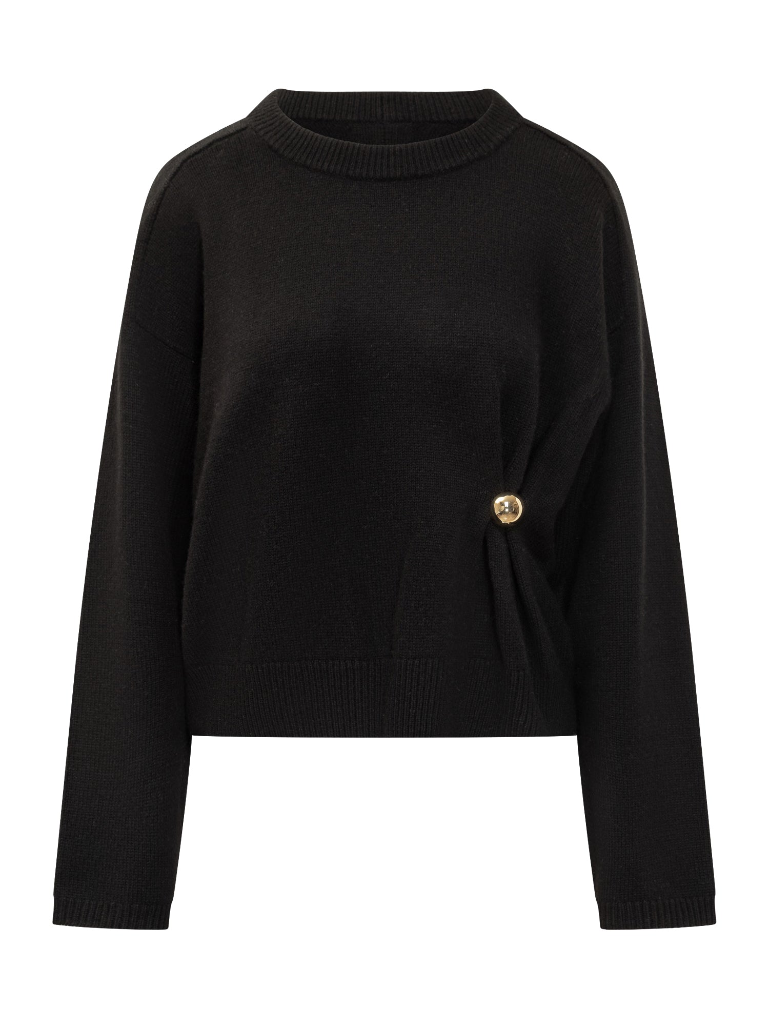 Black sweater by Loulou Studio crafted from soft wool, featuring a minimalist design enhanced with a decorative gold brooch on the side. Relaxed fit, crew neck and ribbed trims.