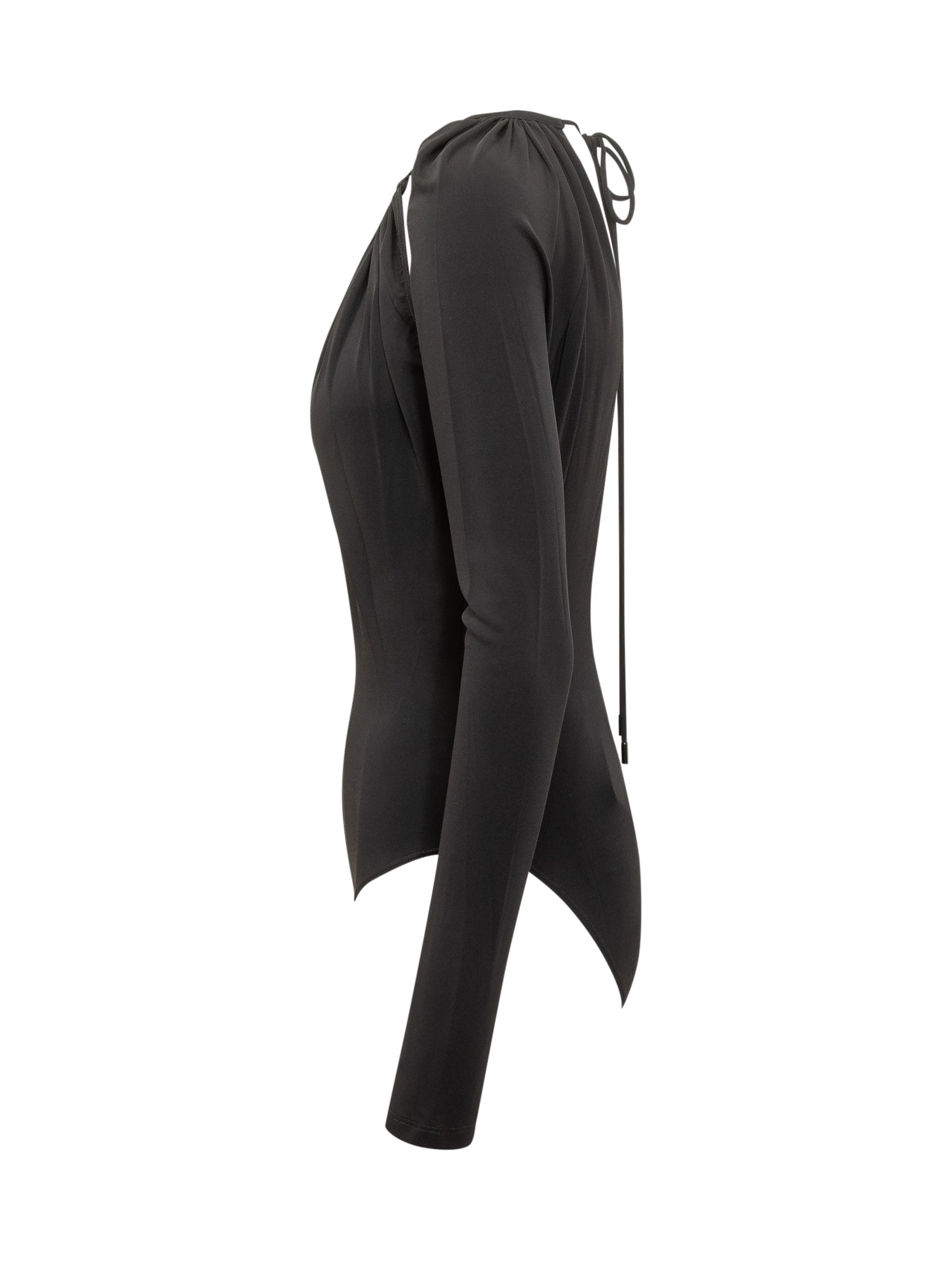 Marine Serre black stretch bodysuit featuring a deep cut out neckline and jeweled detail. Long sleeves and tie closure.