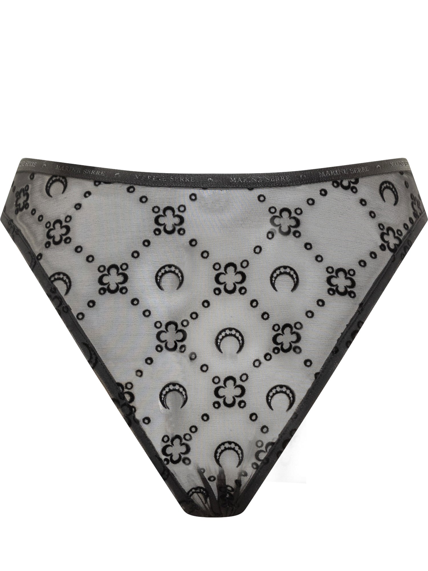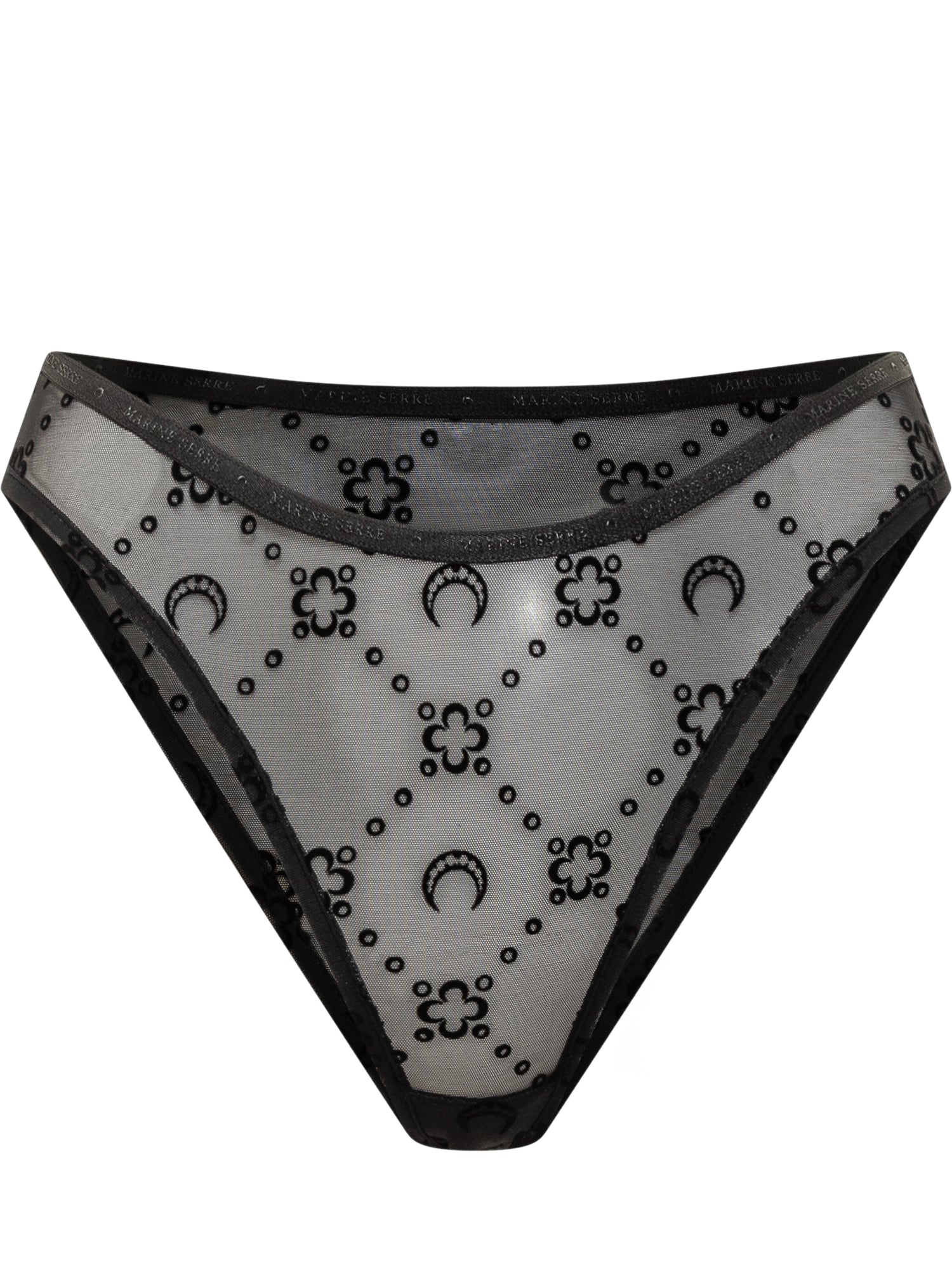 Marine Serre briefs in sheer black tulle with floral embroidery and signature crescent moon logos.