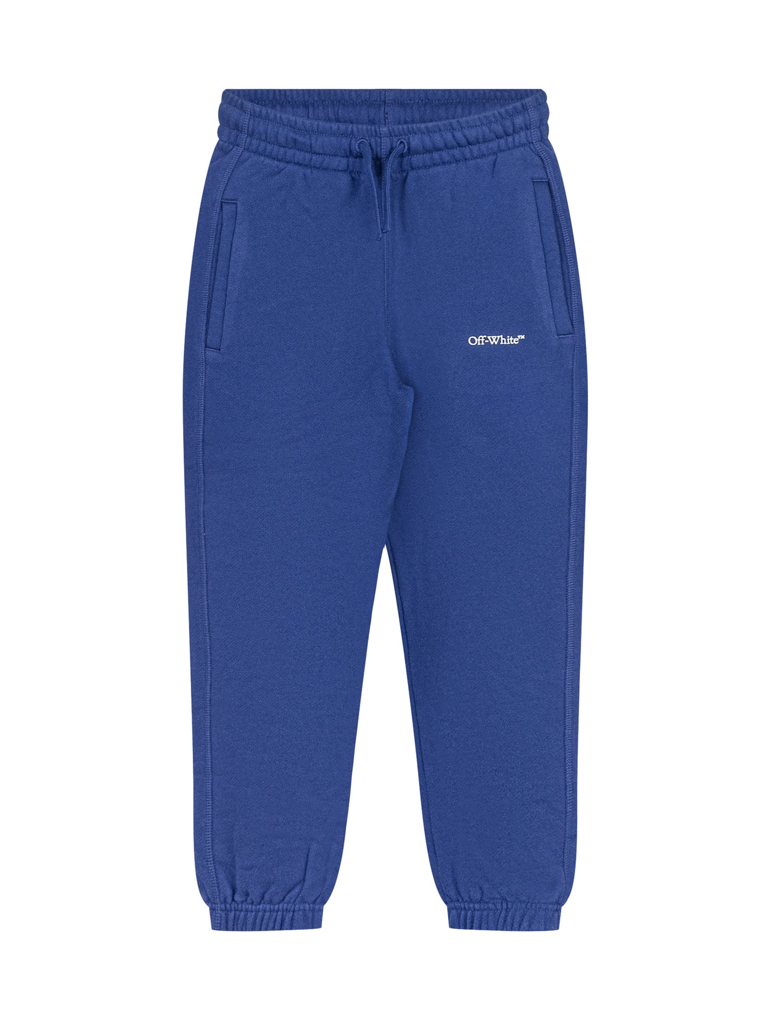 Off-White blue jogger pants featuring elastic waist and ankle cuffs. Embroidered logo on the side.