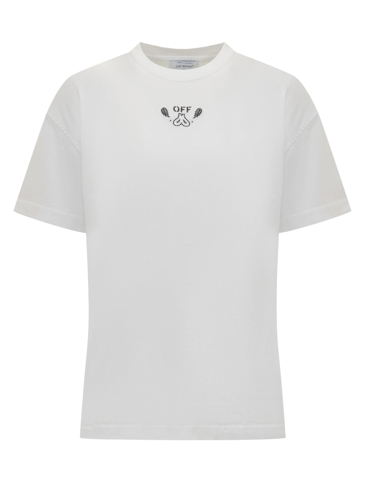 White T-shirt. Short sleeves. Crew neck. Off Bandana logo embroidered on front. Arrow Bandana embroidery on the back.
