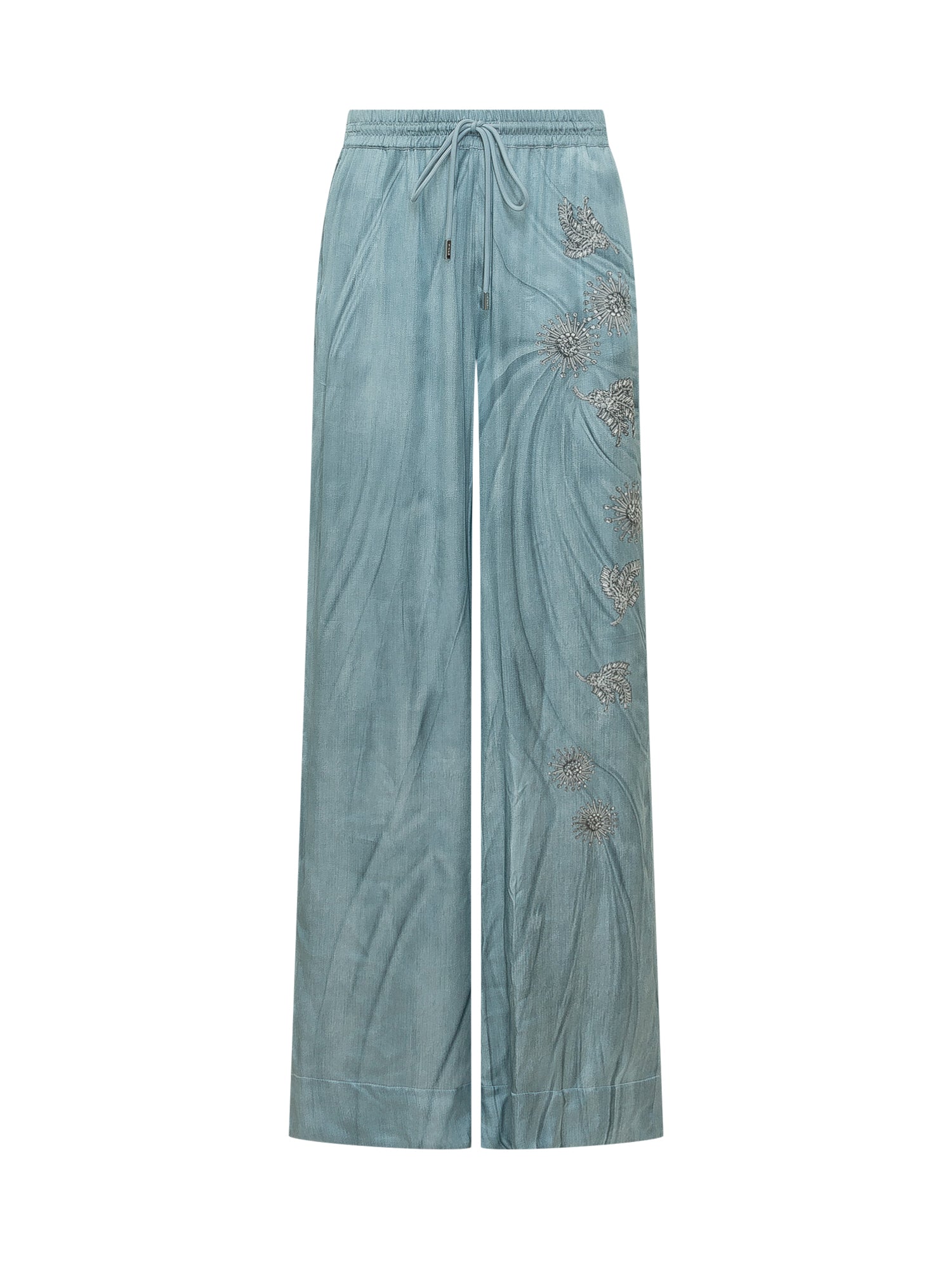 Womens wide leg trousers, elastic waist with drawstring, fluid and comfortable fit, side floral embroidery details.
