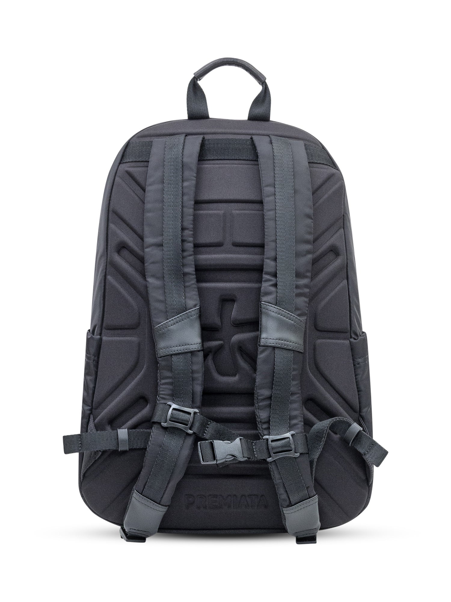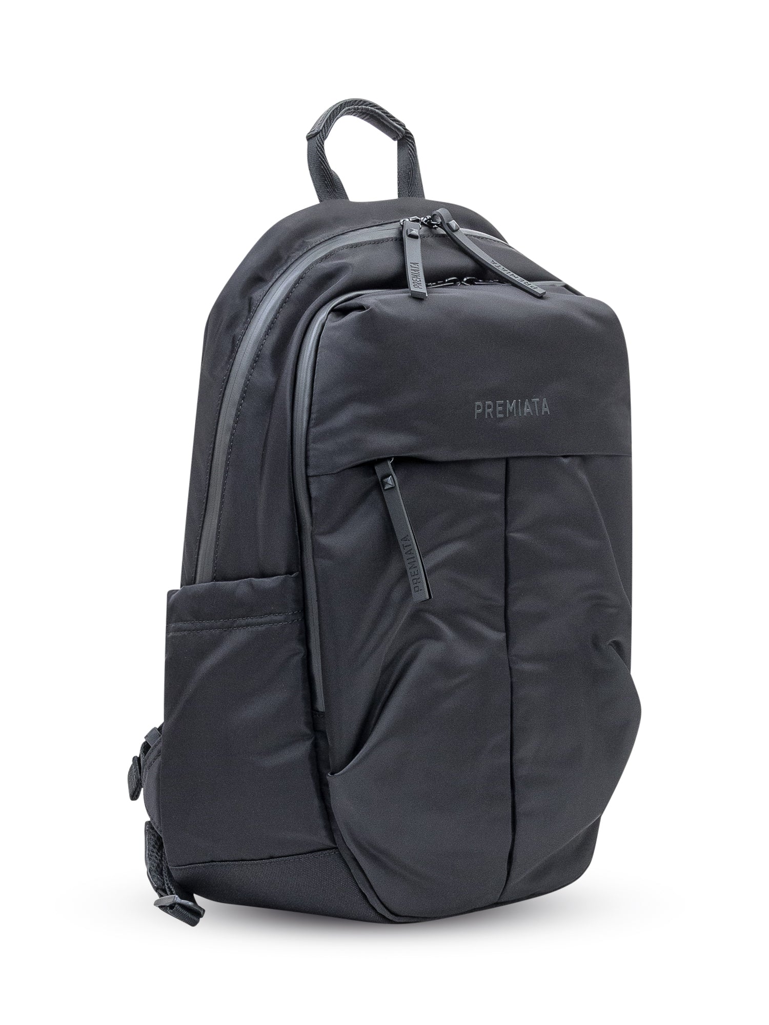 Premiata black technical fabric backpack with tonal logo. Features front zip pockets, adjustable straps, and a double top zip closure.