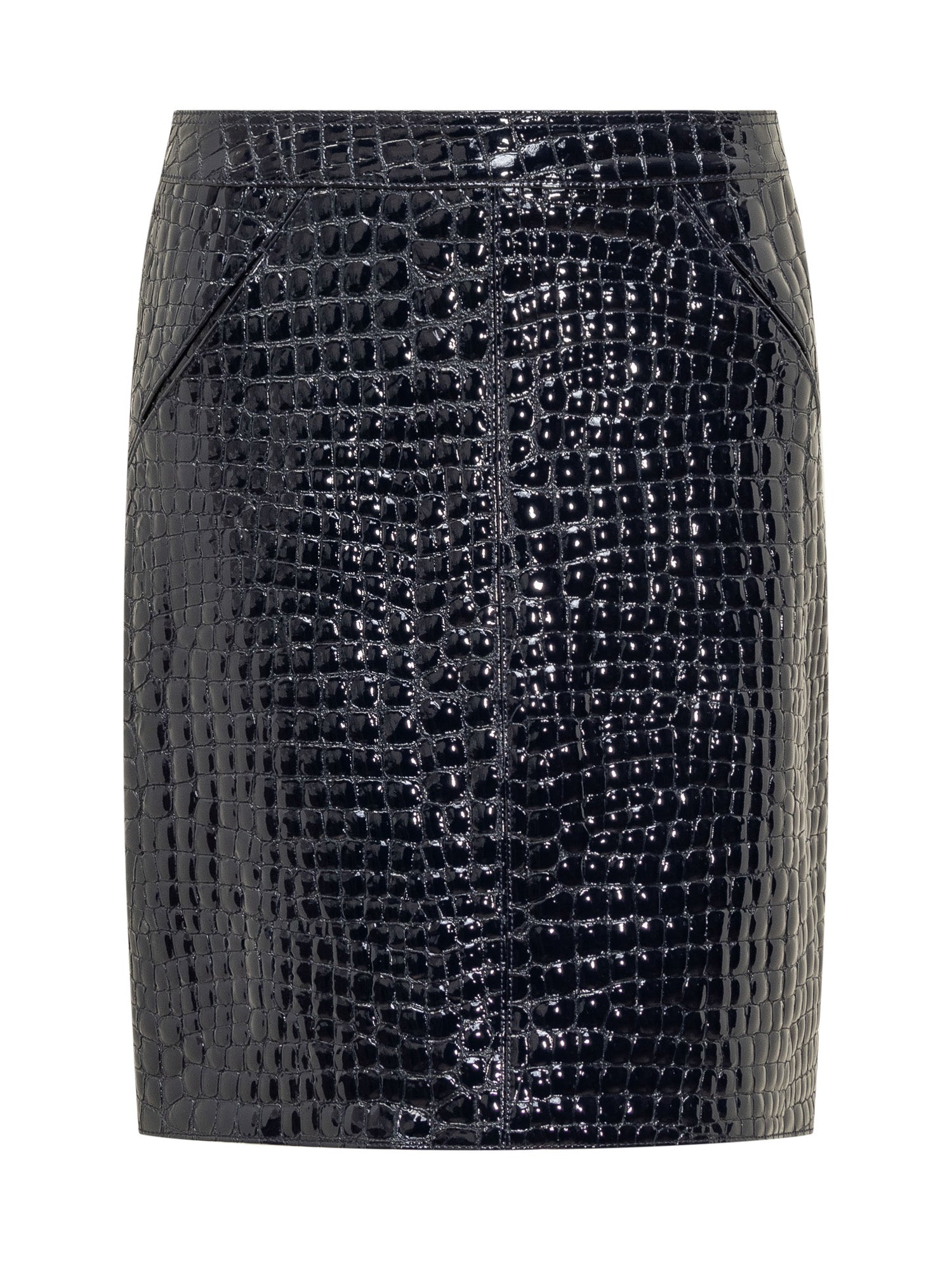 Goatskin leather longuette skirt. Straight line. Back zipper closure. Two welt pockets at front. Pleated back hem. Made of crocodile-embossed leather. Lined.