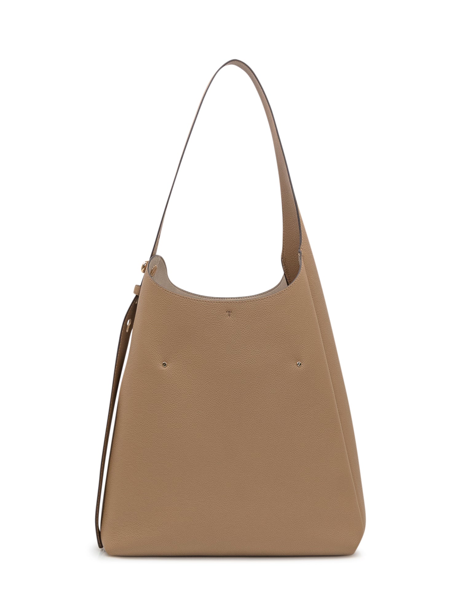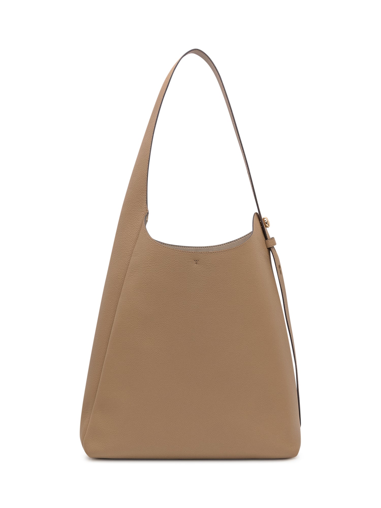 Crafted from grained leather in an elegant taupe shade, this Tory Burch hobo bag features a sleek, minimalist silhouette. Designed with a single shoulder strap, it closes with a practical hook clasp and includes an internal pocket for convenient storage.