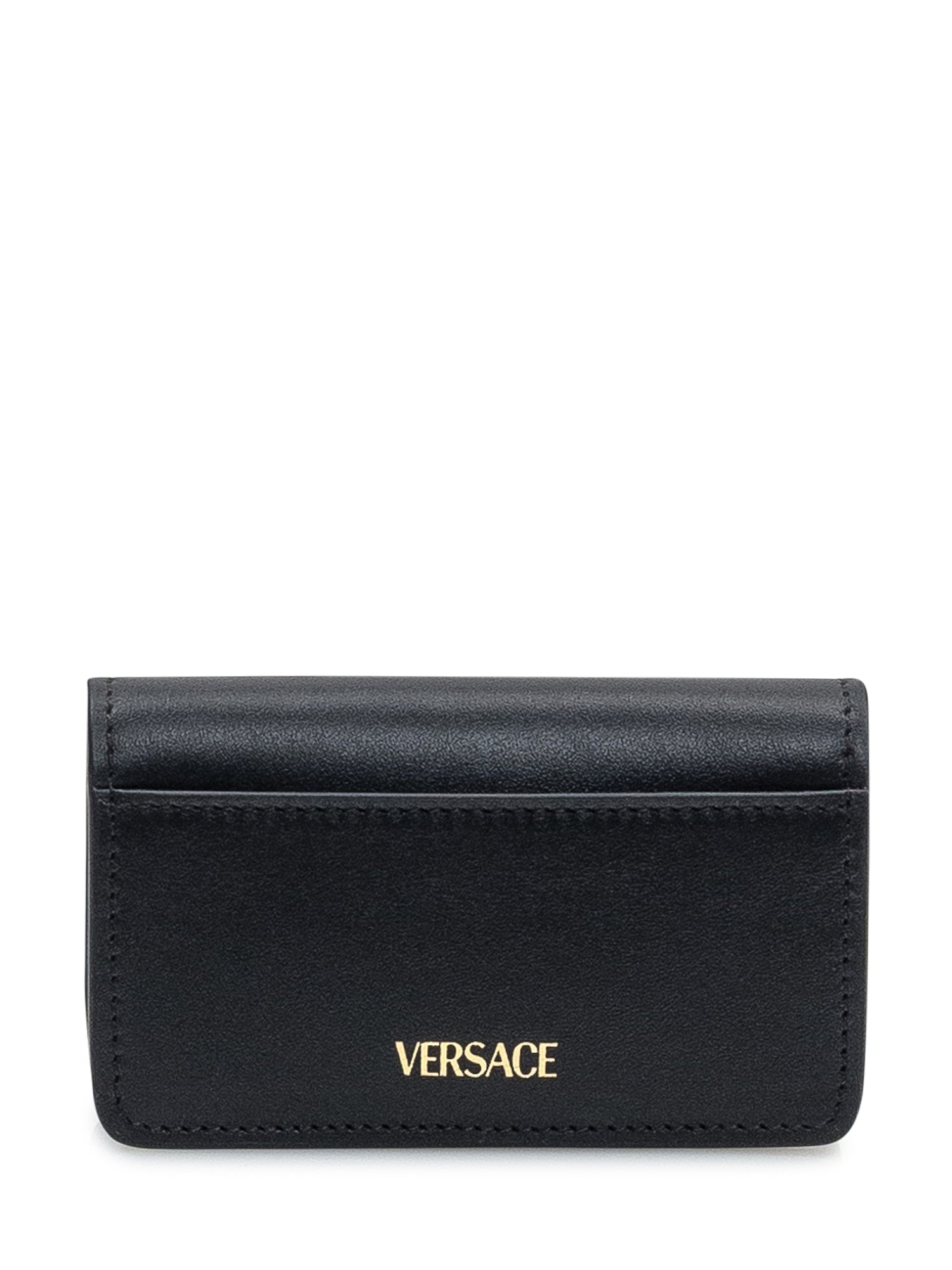 Black leather key holder with iconic gold Medusa logo. Compact and refined design, ideal for keeping keys with elegance and the signature Versace luxury touch.