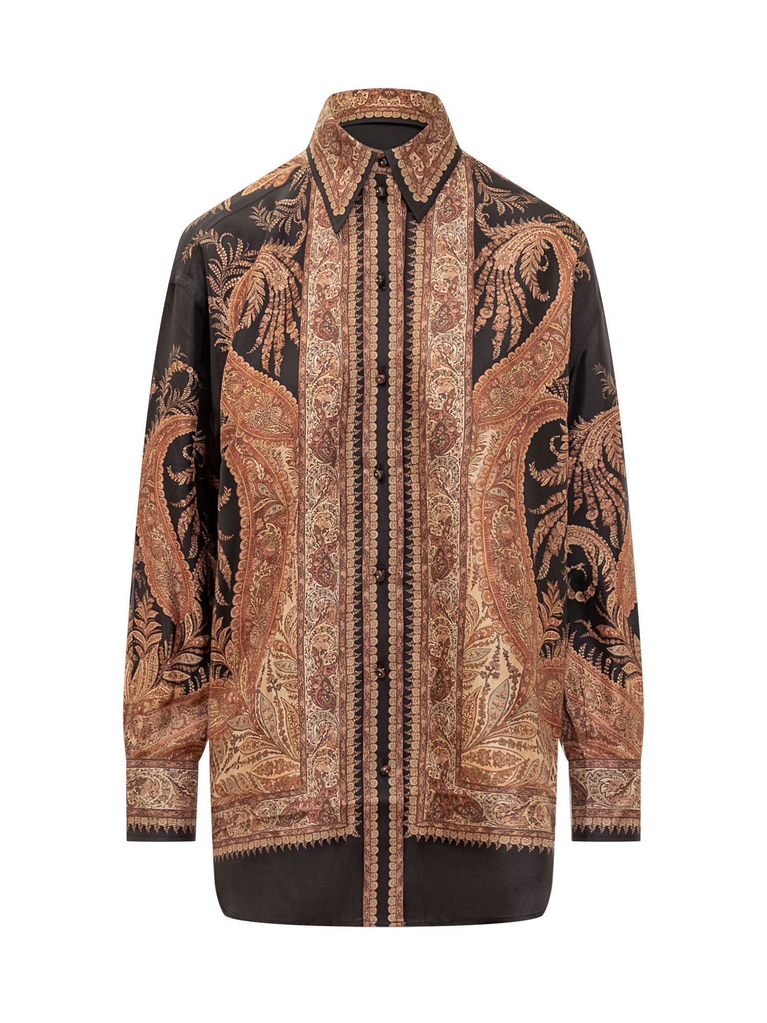 Silk shirt with paisley print in brown and gold tones. Oversized fit, classic collar and button closure.