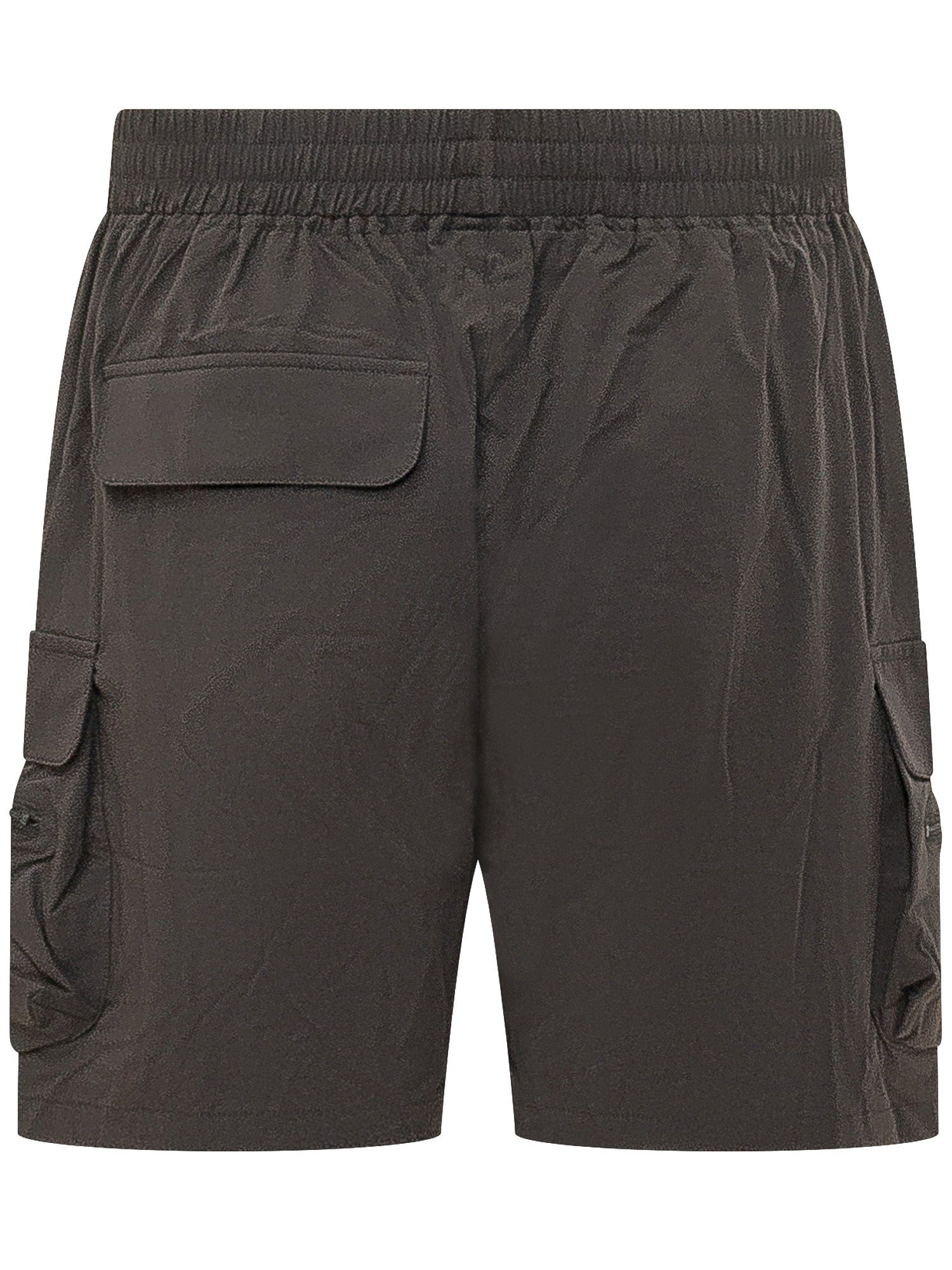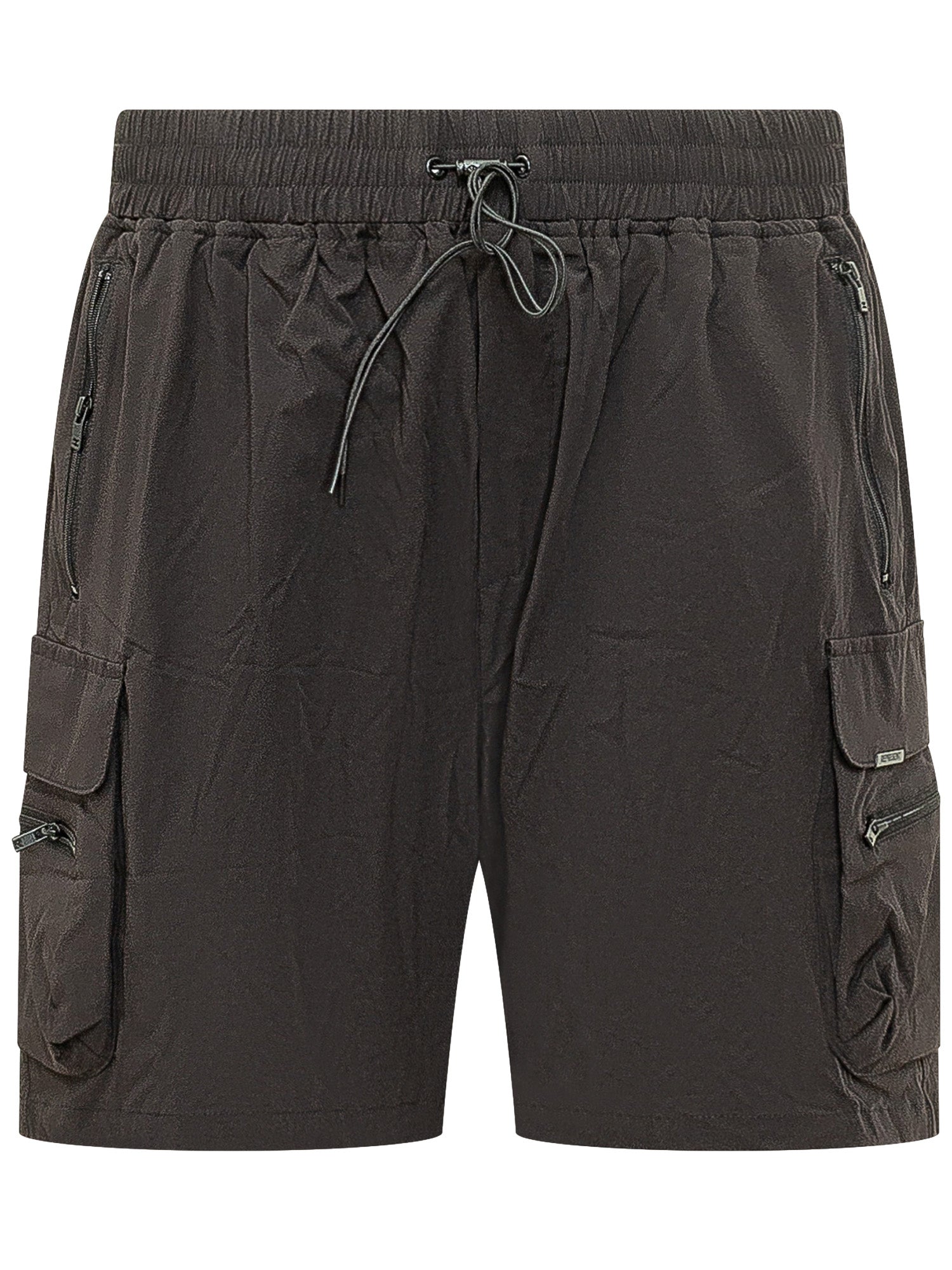 Shorts cargo con vita elasticizzata e coulisse, tasche frontali con zip, tasche laterali con patta e zip.