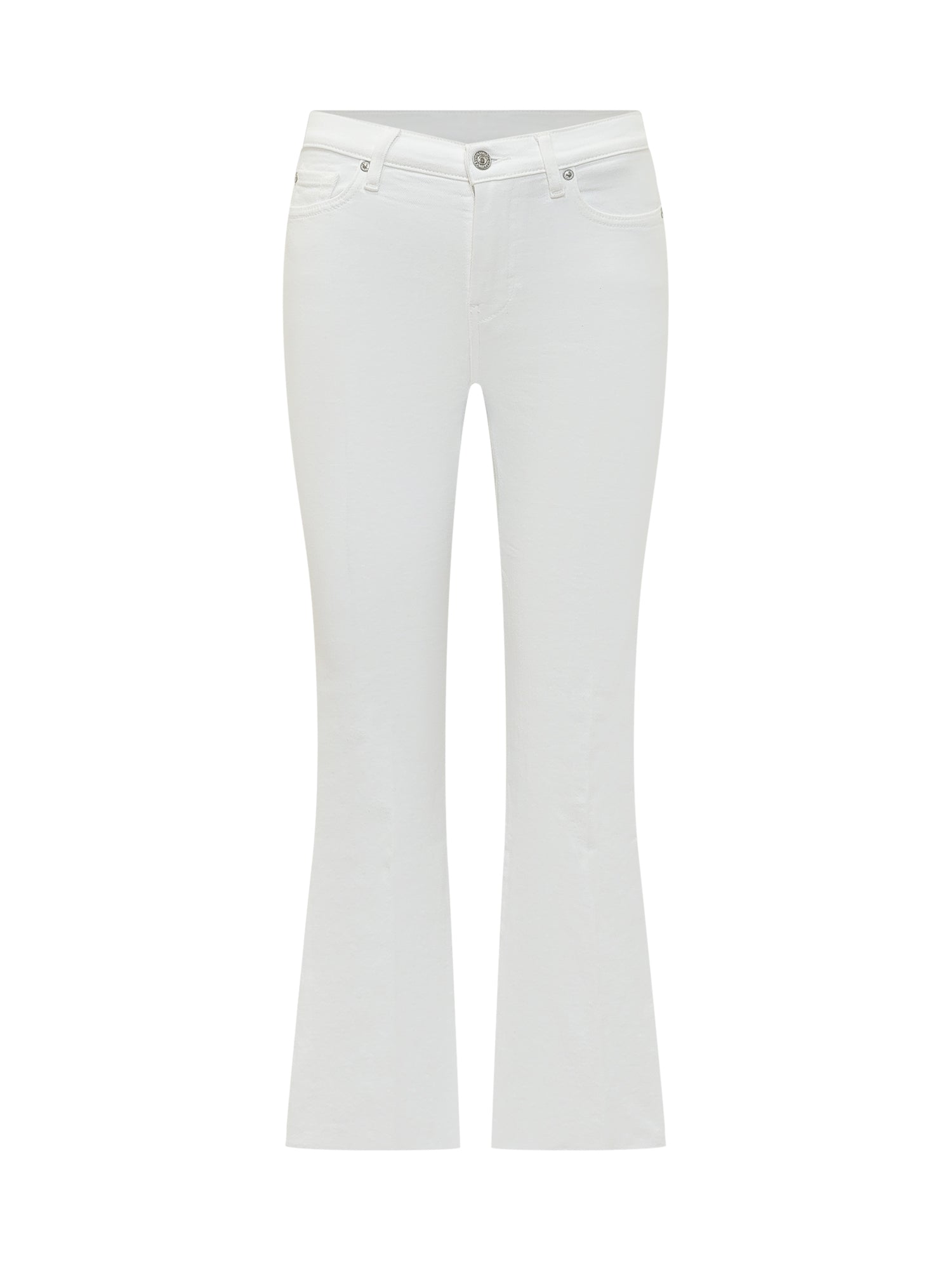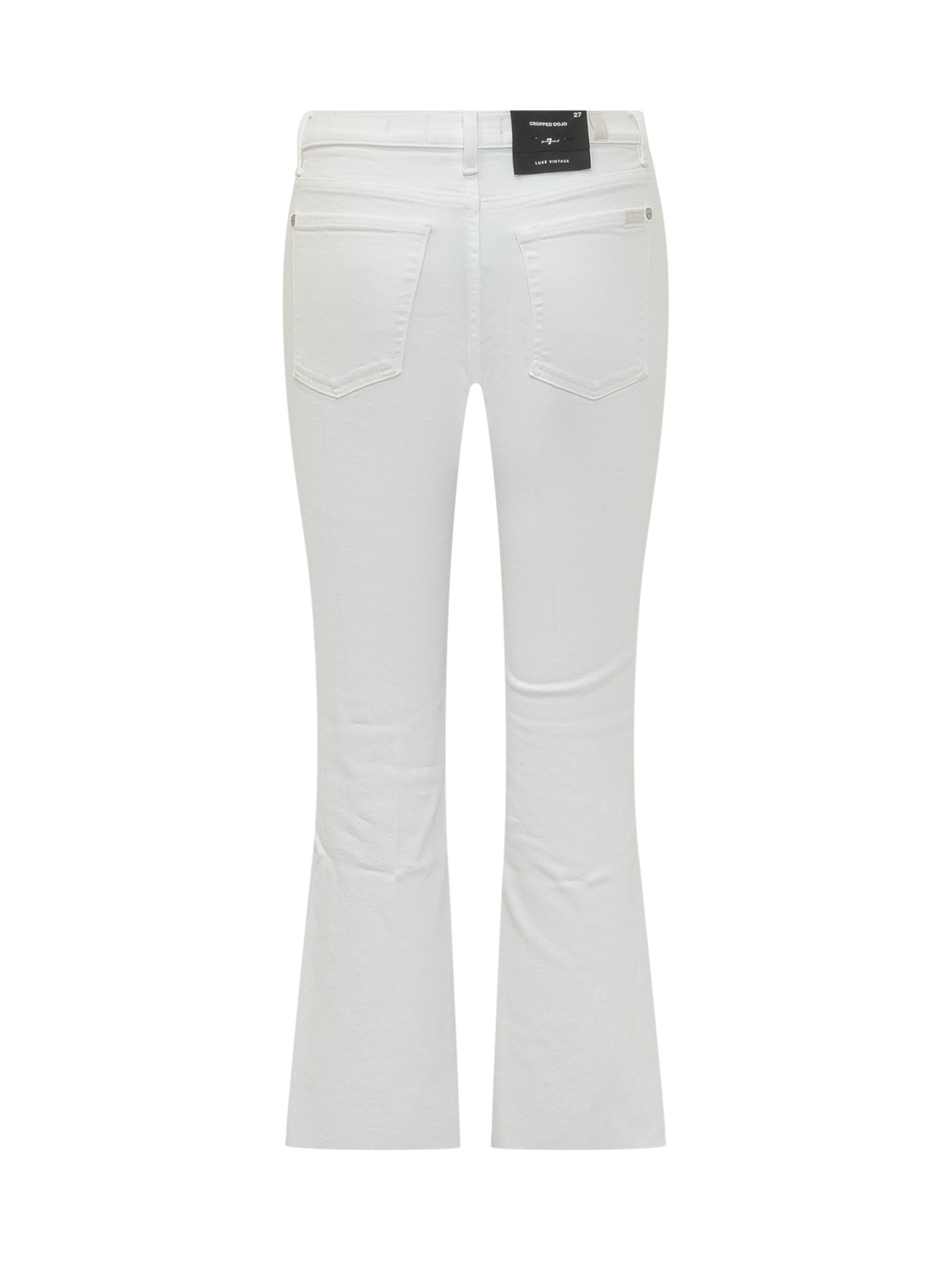 Jeans con cinque tasche e chiusura con bottone. Gamba svasata con lunghezza cropped per uno stile femminile e attuale.