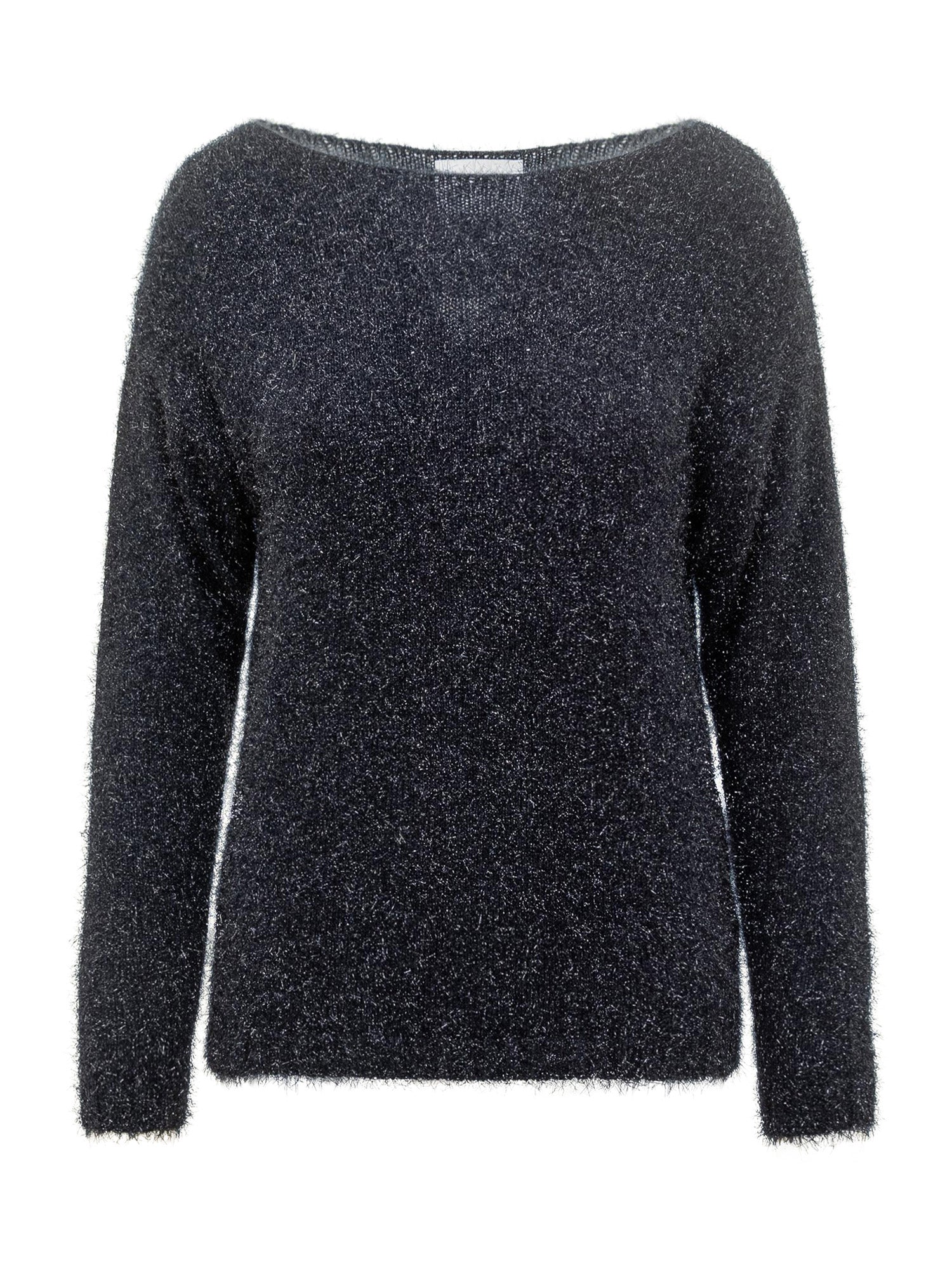 Maglia Alpha Studio nera a maniche lunghe con filato lurex effetto brillante e scollo a barca. Un capo elegante e luminoso, perfetto per look da sera sofisticati.