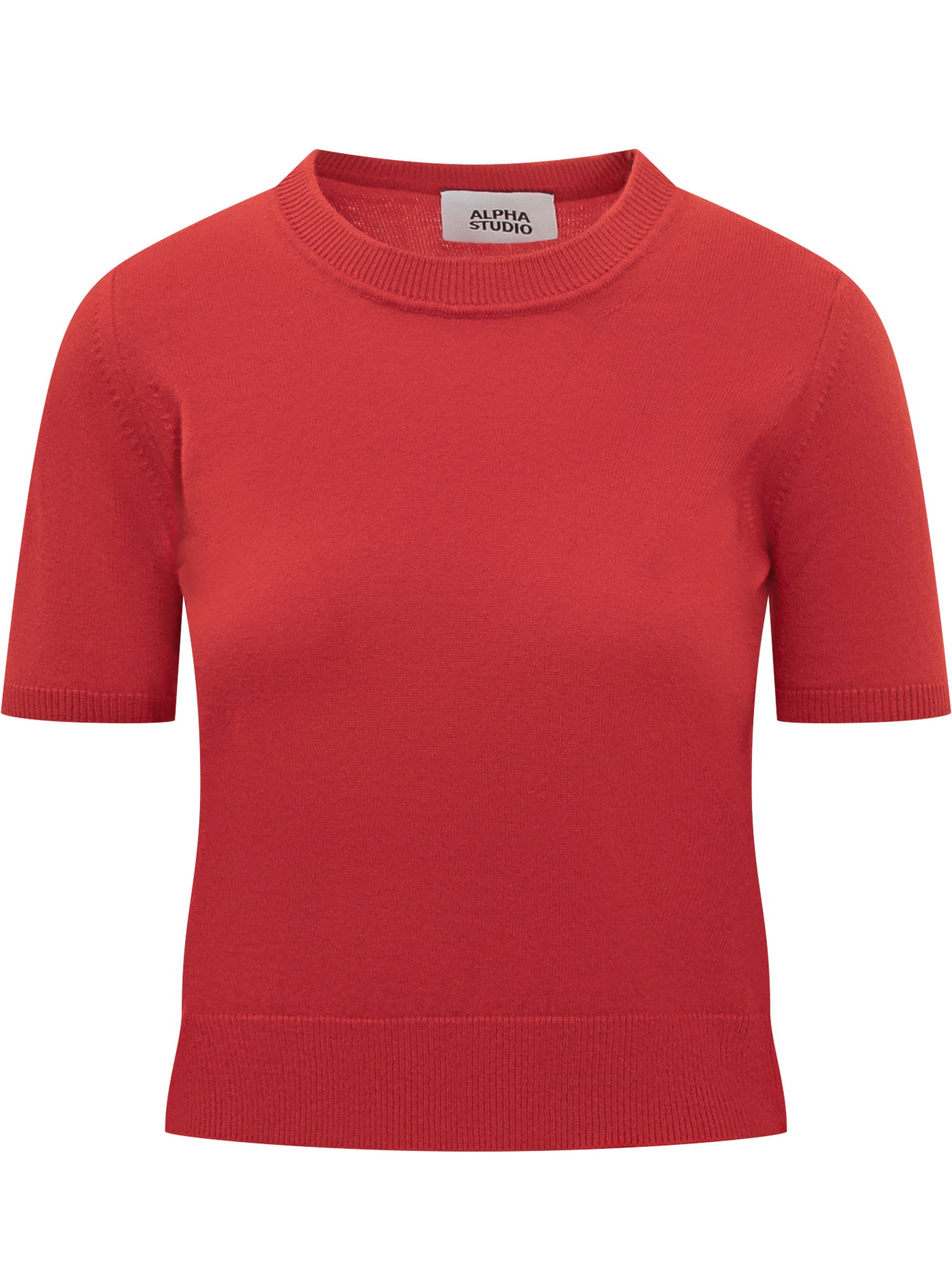 Maglia Alpha Studio in lana leggera rossa con girocollo e maniche corte. Un capo essenziale dal taglio pulito, perfetto per look raffinati e versatili.