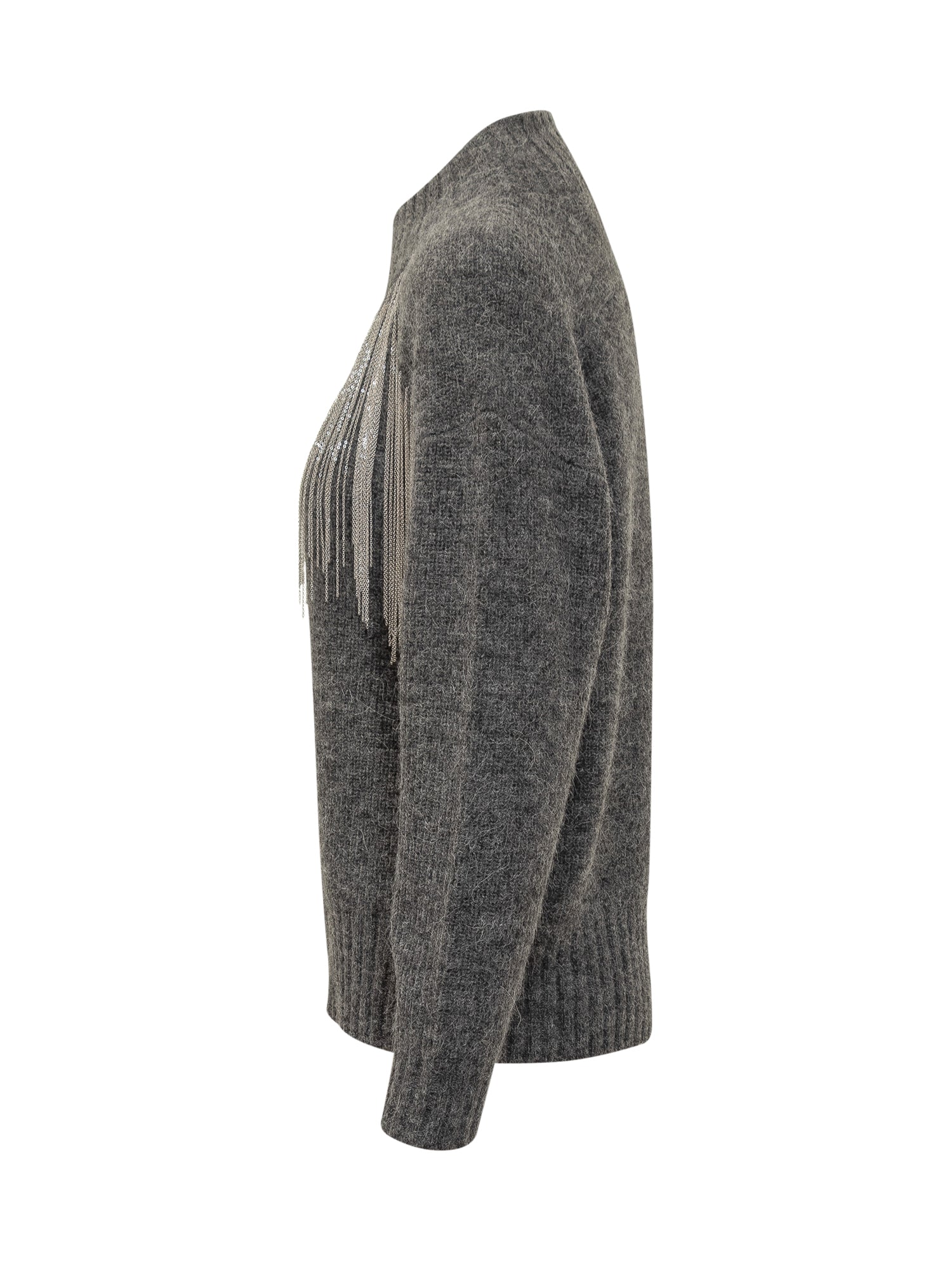 Maglione Alpha Studio in morbida lana grigia con frange gioiello sul davanti. Collo alto e linea rilassata per un look elegante.