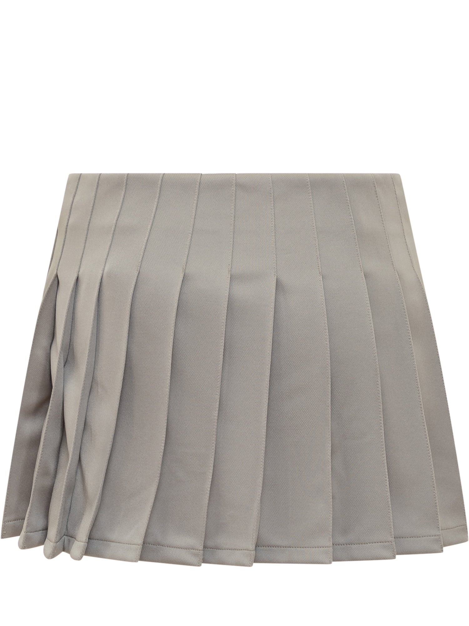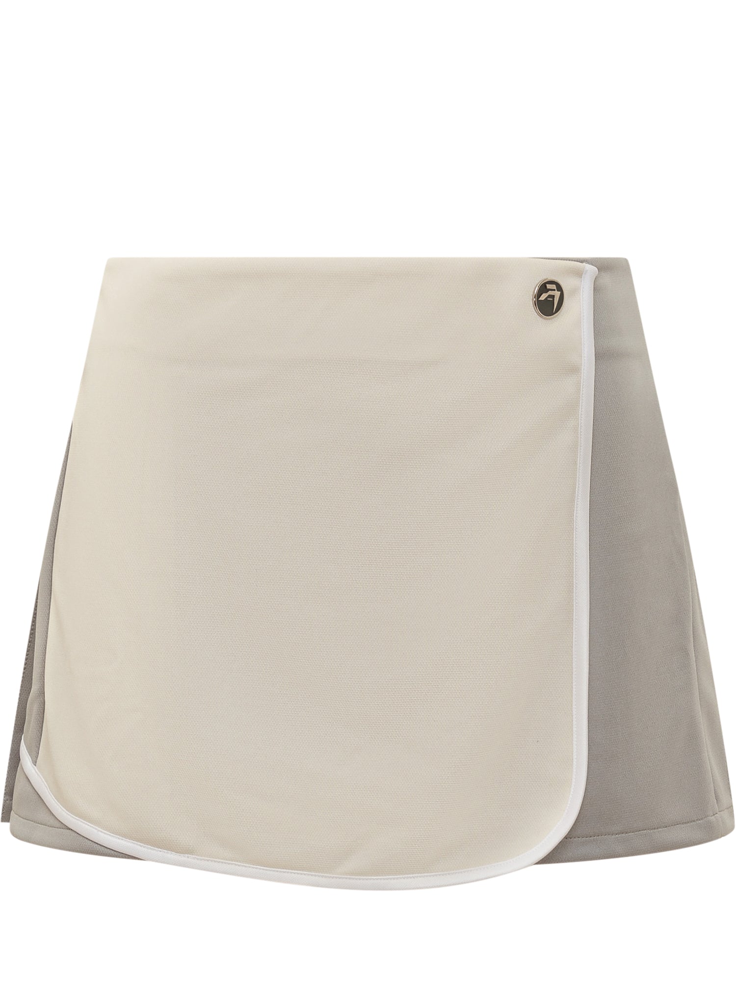 Gonna corta. Chiusura con bottoni. Logo "AMBLEM". Pieghe sul retro.