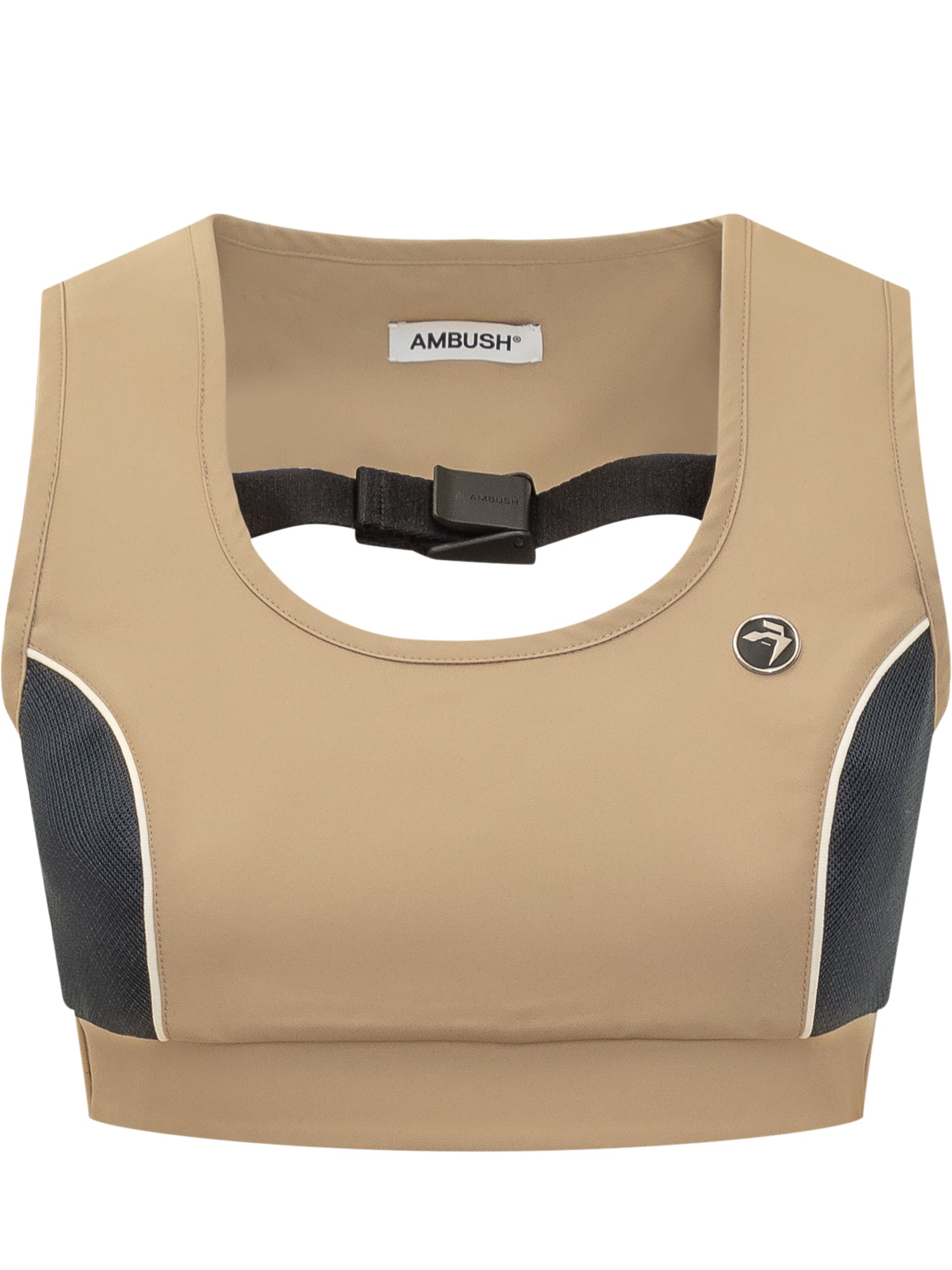 Reggiseno sportivo in spugna. Girocollo. Logo "AMBLEM" sul davanti. Chiusura con cintura sul retro.
