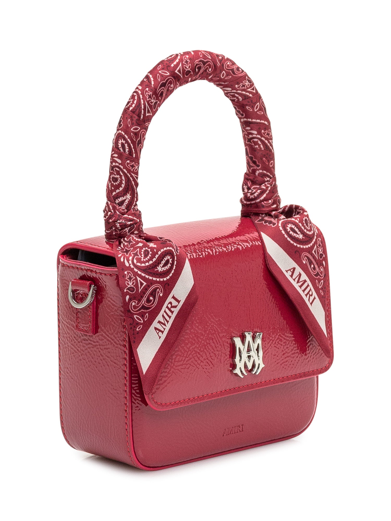 Mini borsa a mano in pelle con manico avvolto in bandana e logo metallico frontale. Design compatto e strutturato.