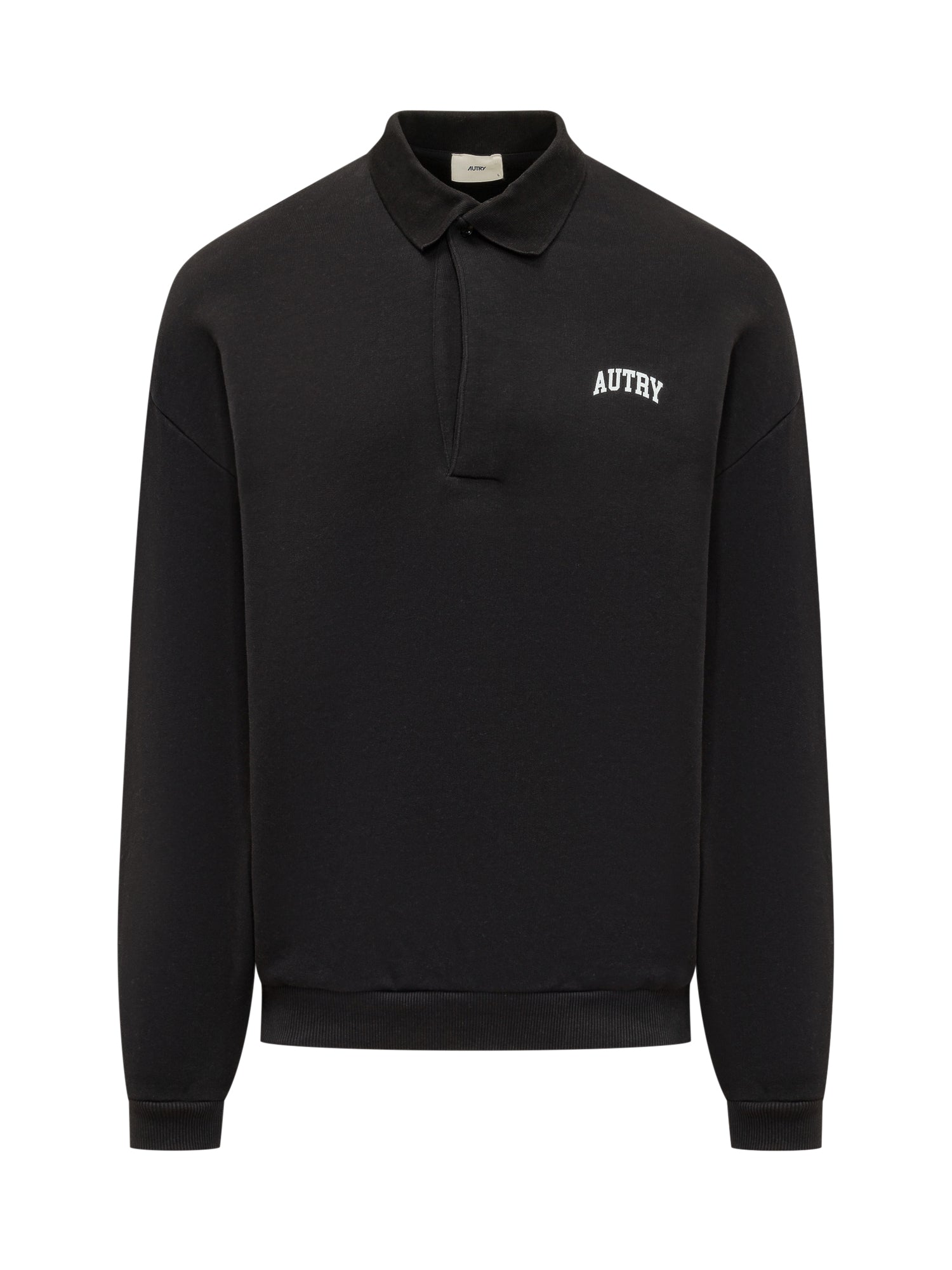 Felpa con colletto polo e chiusura con bottoni nascosti. Modello con maniche lunghe e logo frontale visibile, fondo e polsini rifiniti a costine per una linea definita e pulita.