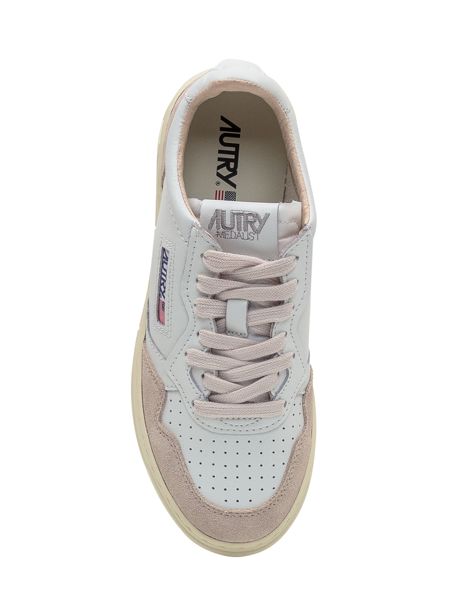 Sneakers Autry Medalist in pelle liscia e camoscio nei toni bianco e beige. Design rétro ispirato agli anni 80, con logo ricamato laterale, suola in gomma e punta traforata per la massima traspirabilità.