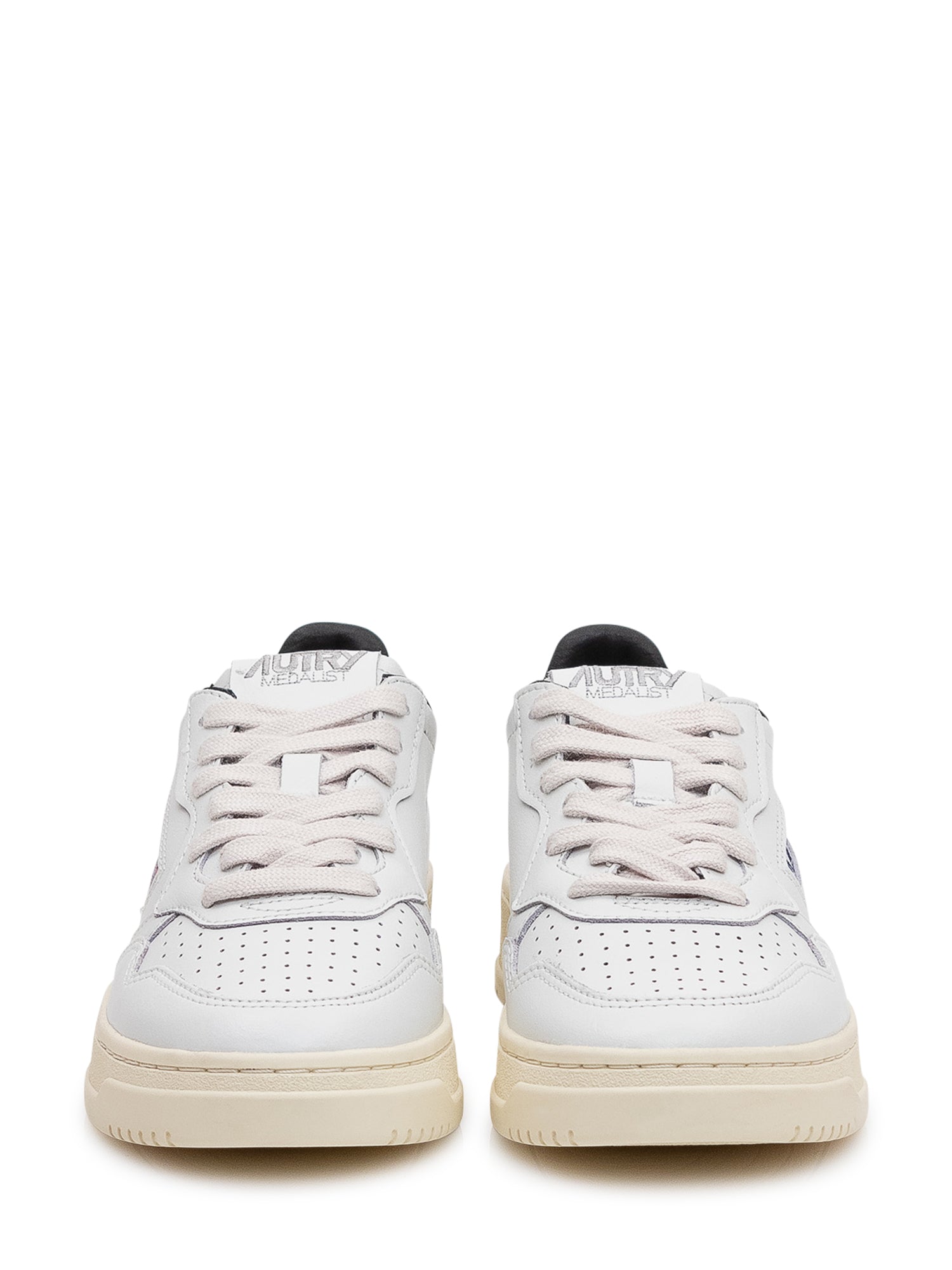 Sneakers basse in pelle con punta traforata e suola piatta. Tallone a contrasto e scritta laterale dal carattere sportivo.