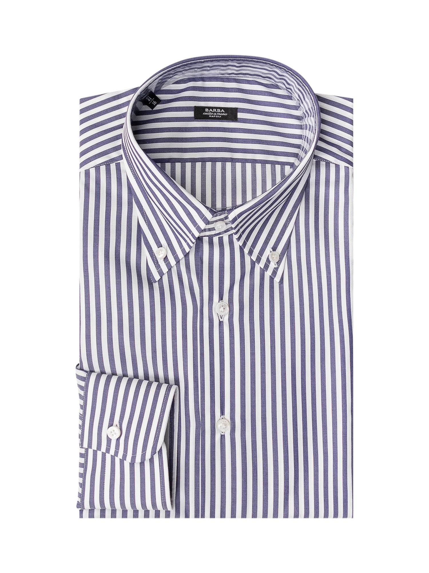 Camicia a righe verticali viola e bianche con collo button-down e chiusura frontale con bottoni. Poini con bottone e design raffinato, perfetta per look business e smart casual.