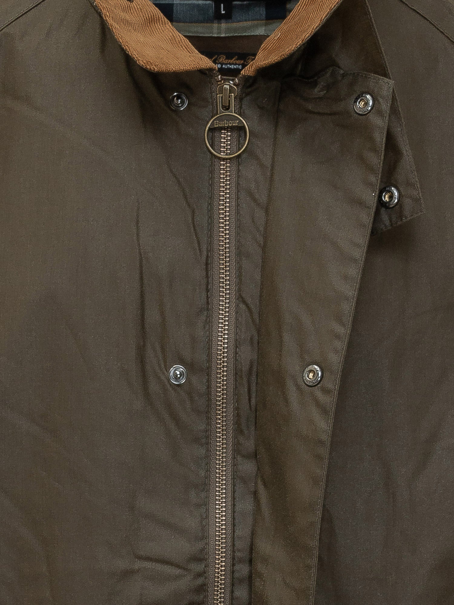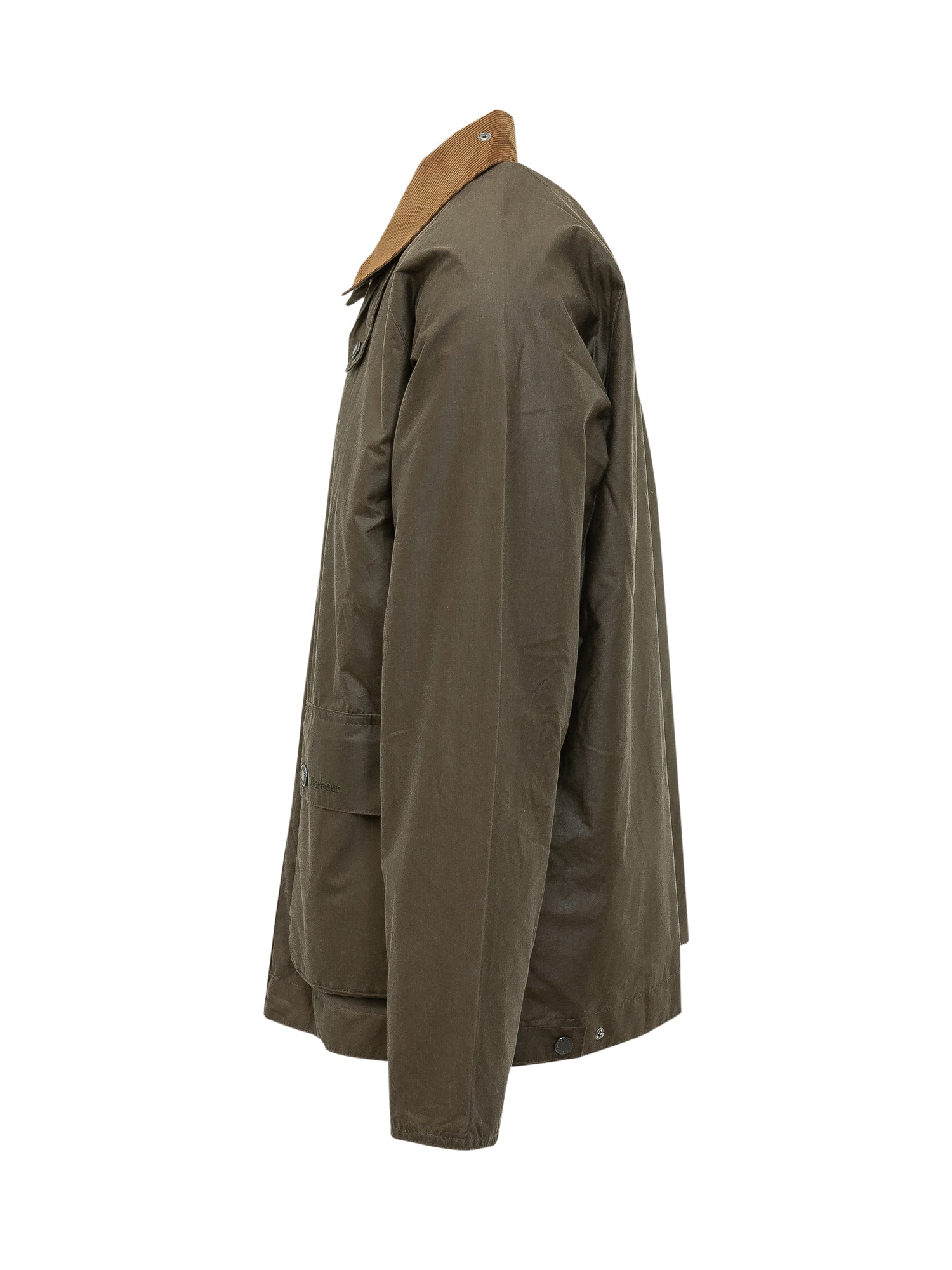 Giacca cerata con colletto in velluto a coste, chiusura frontale con bottoni a pressione e tasche applicate. Linea regolare e costruzione resistente.