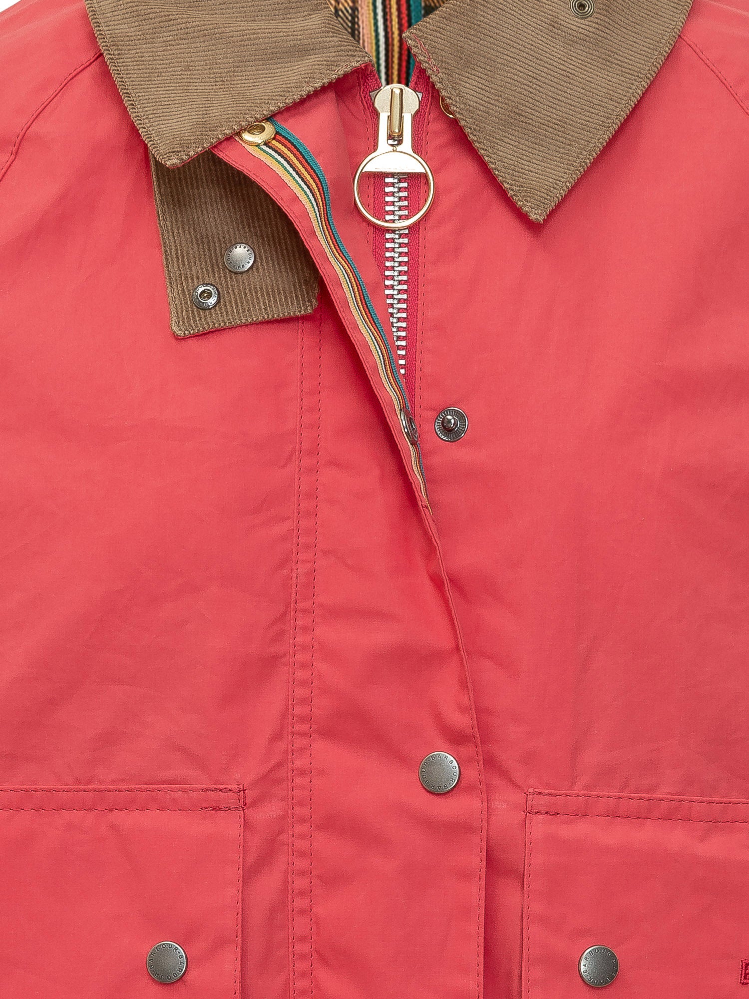 Giacca corta modello Spey con colletto in velluto a coste a contrasto. Chiusura frontale con bottoni a pressione e tasche applicate con patta. Linea iconica e vestibilità contemporanea, ideale per completare look casual con un tocco distintivo.