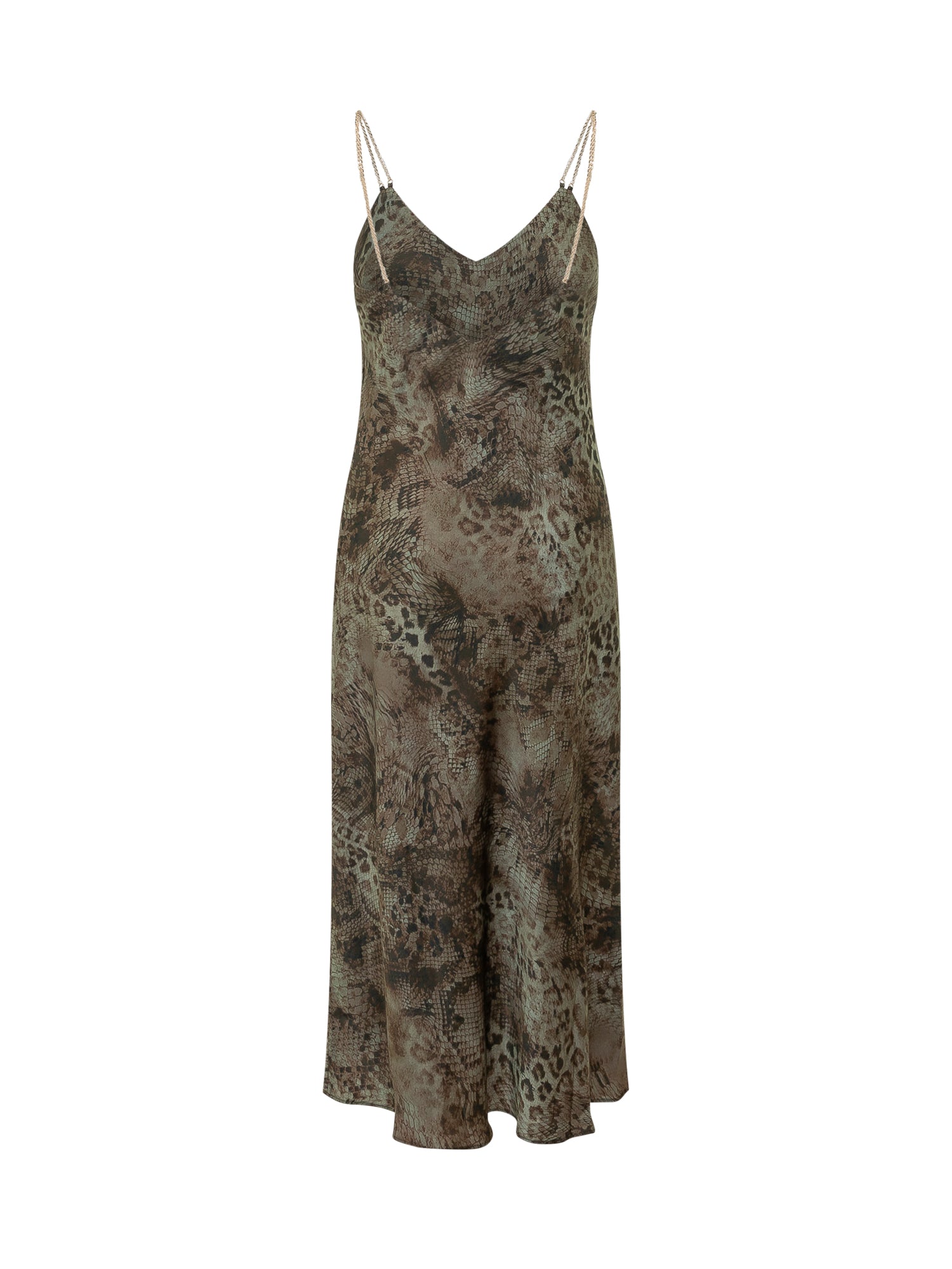 Abito lungo con scollo a V e spalline sottili. Stampa animalier all over e linea fluida.