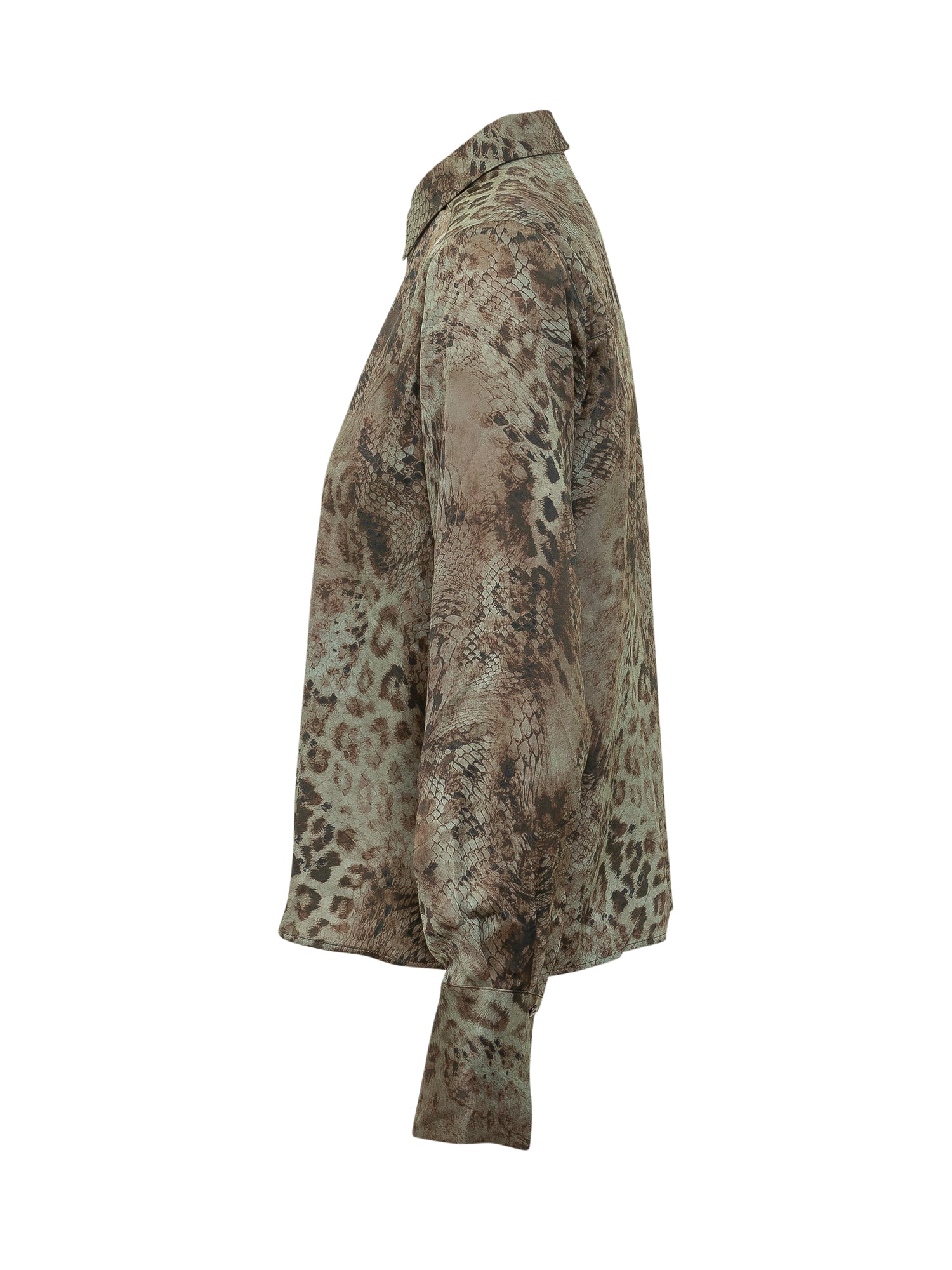Camicia con colletto classico e chiusura con bottoni. Maniche lunghe e stampa animalier all over.