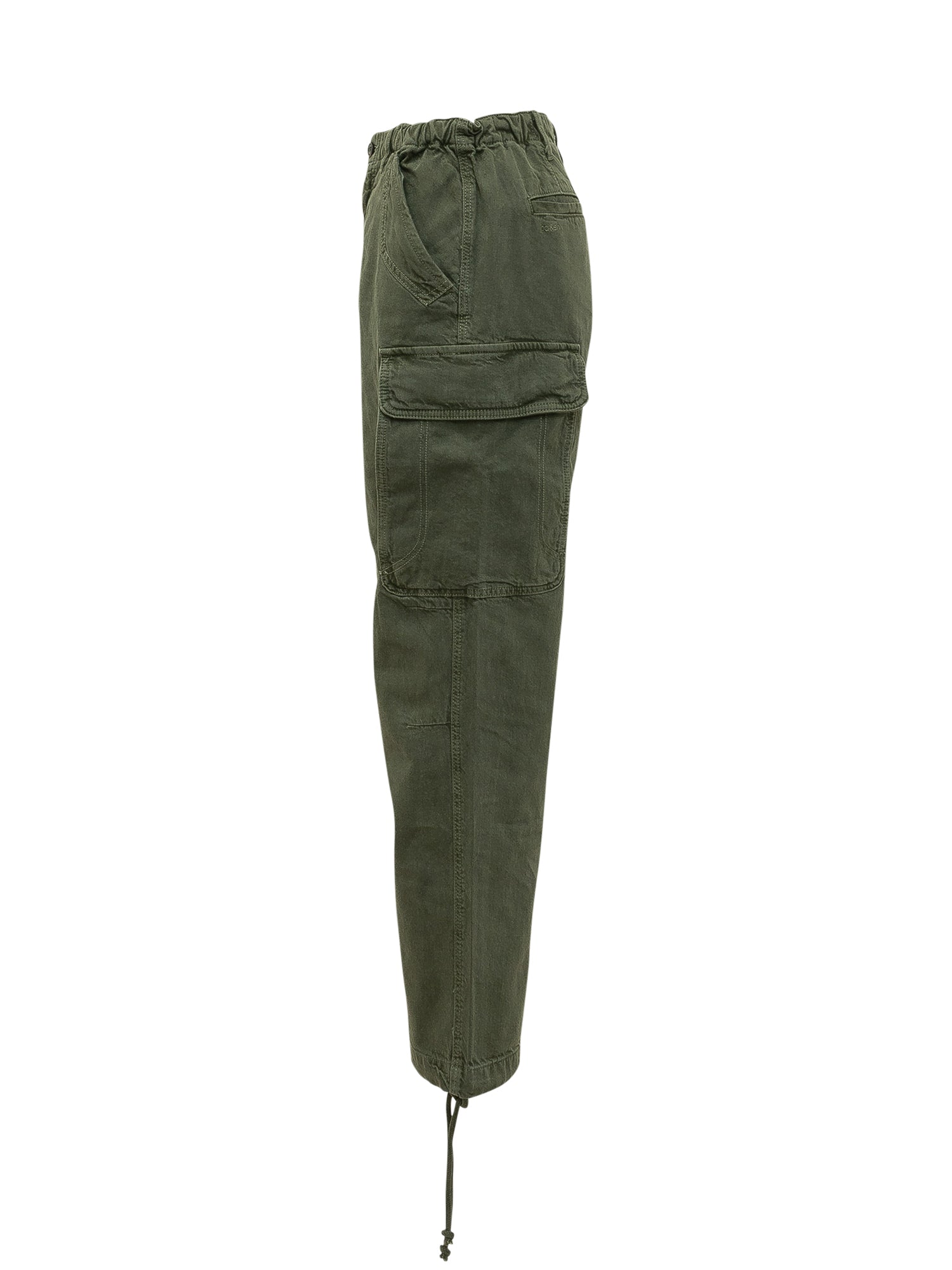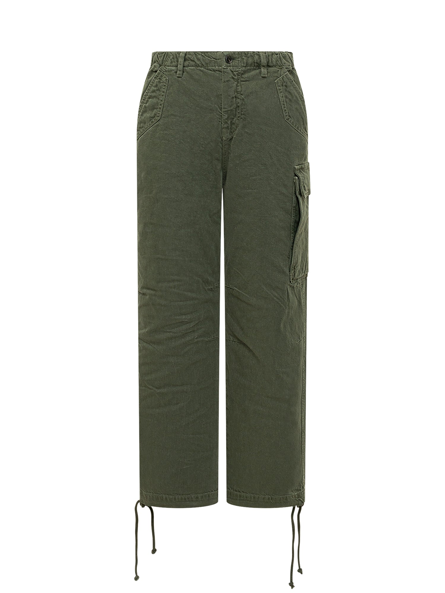Pantaloni lunghi con chiusura frontale e passanti in vita. Tasca cargo laterale e coulisse al fondo.